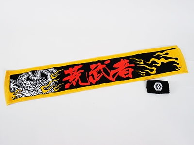 荒武者新作マフラータオルは、歴代のコスチュームでよく使われていた「赤・黄・白・黒」のど派手なカラーリングを採用。