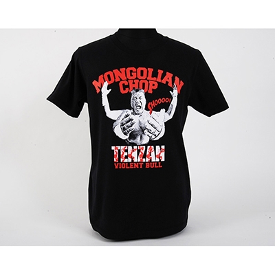 "天山広吉選手のモンゴリアンチョップを放つ写真を生かしたピクチャーTシャツ。バック面にはダイビングヘッドバッドを放つ姿もワンポイントでプリント。
