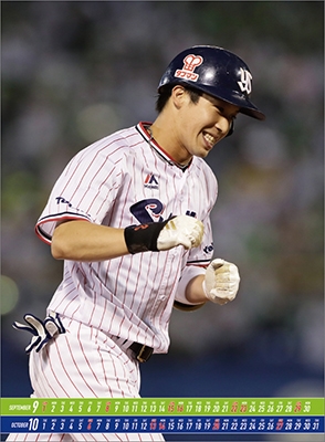 華麗なバッティング写真をメインに構成。笑顔の写真もファンにはうれしいポスタカレンダーです。