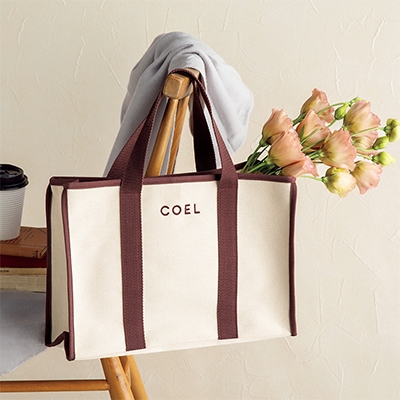 ハンドルや刺繍にはトレンドのブラウンをきかせて、大人が持ちやすいデザインに。雑誌も余裕のA4サイズ対応&自立する厚手生地で使い勝手も抜群です。