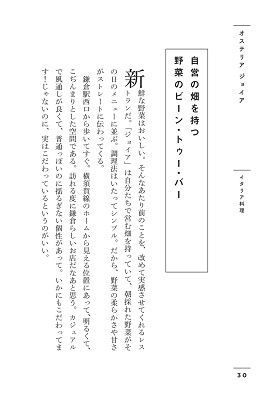 お屋敷街に佇む未来の老舗(イチリンハナレ)、自営の畑を持つ野菜のビーン・トゥー・バー(オステリア・ジョイア)、カレーもいいけれど私はビーフサラダ(珊瑚礁 本店)、今はなき丸山亭の流れをくむ一軒(ブラッスリー・シェ・アキ)、かつての鎌倉文士に想いを馳せながら(天ぷら ひろみ)……ガイドブックやグルメサイトでは絶対にわからない、鎌倉育ちだから知っているおいしさと魅力に出会える1冊。