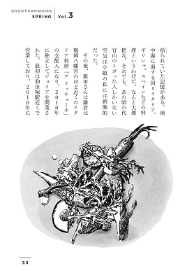 版画のように精緻なタッチで描かれた阿部伸二によるイラストも美しく、まさに読んでおいしい、これまでなかった大人のための鎌倉グルメエッセイ。