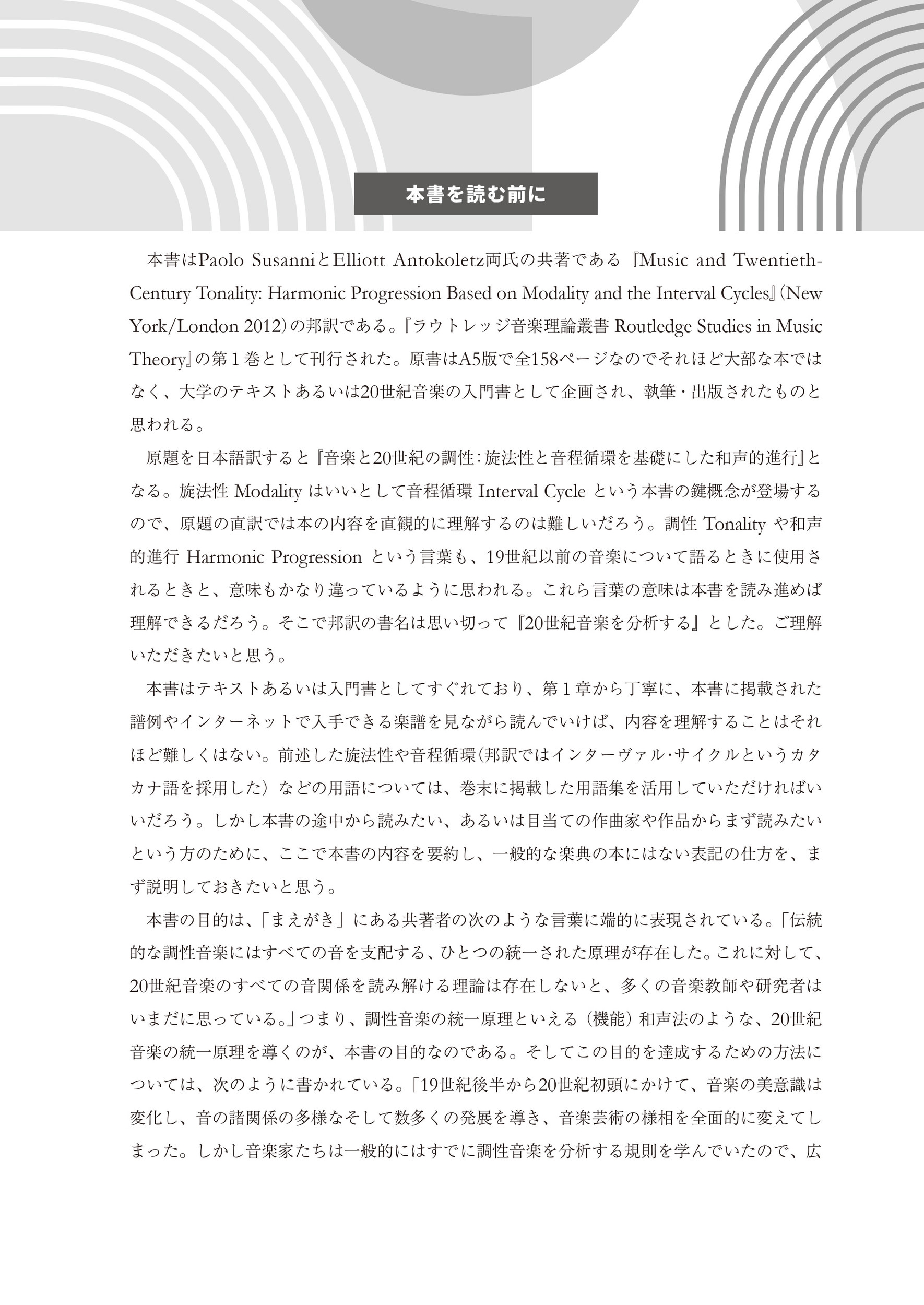 また、第2章・第3章で論じられる「インターヴァル・サイクル」から、第4章での「シンメトリー」や「軸」、そして第5章で扱われる「旋法」にいたるまで、様々な角度の概念や技法が紹介されており、20世紀音楽を理解するうえでの入門書として大いに活用できるだろう。さらに、翻訳に際して巻末に「用語集」を追加し、より理解が深まるよう配慮している。