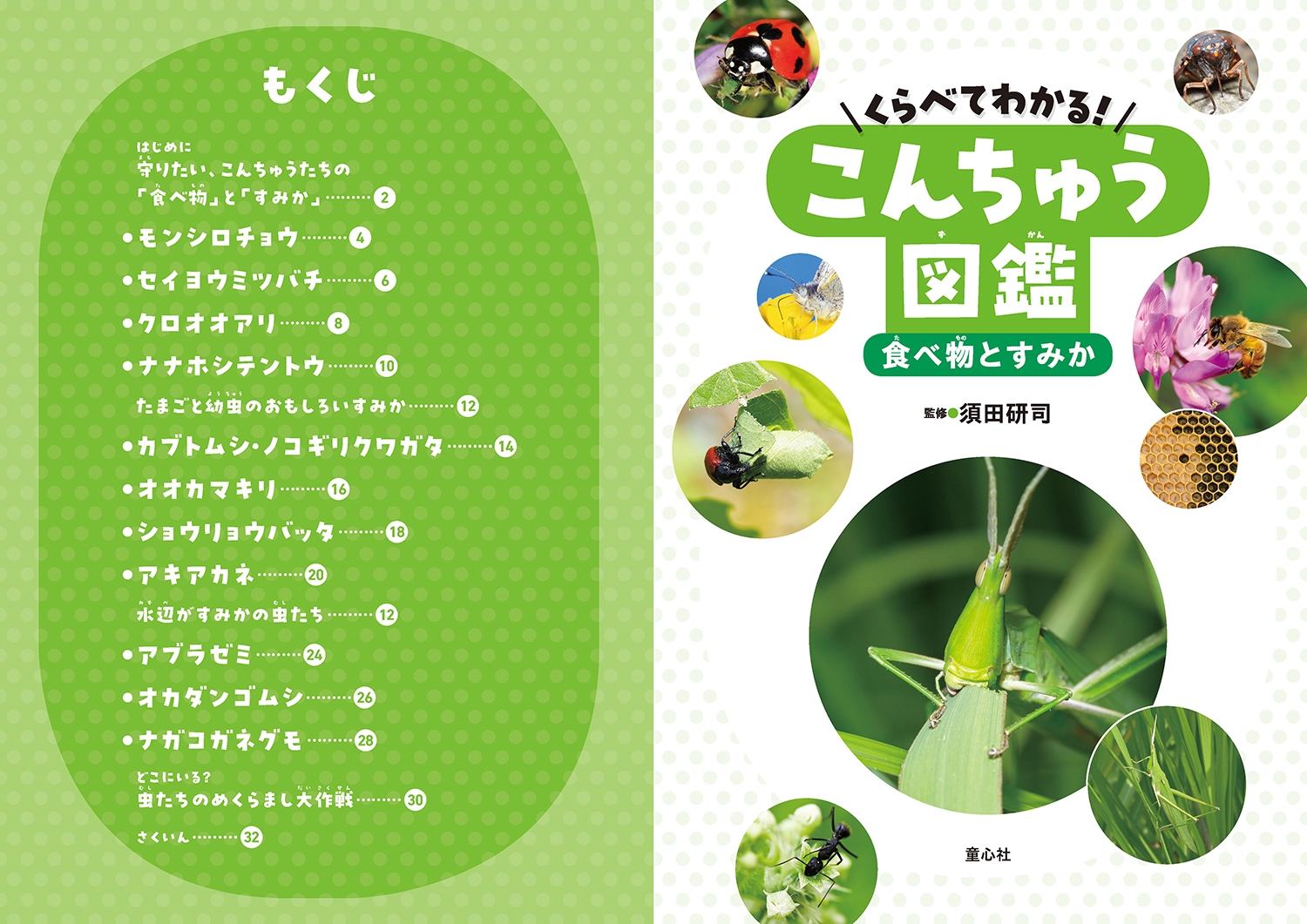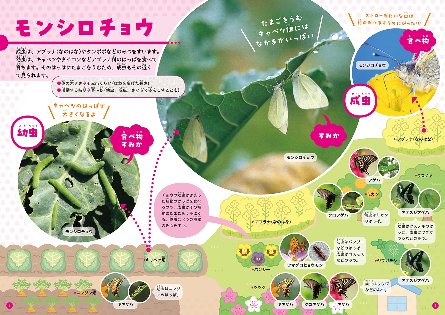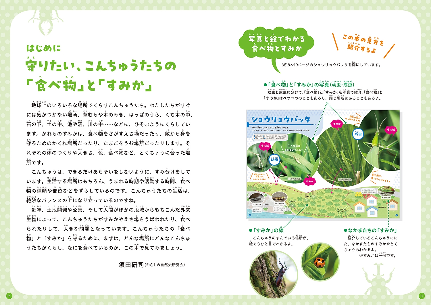 代表的な昆虫のすみかやそれに応じた食べ物を紹介。イラストと写真で、成虫と幼虫の違いや、種類による違いもわかる。
