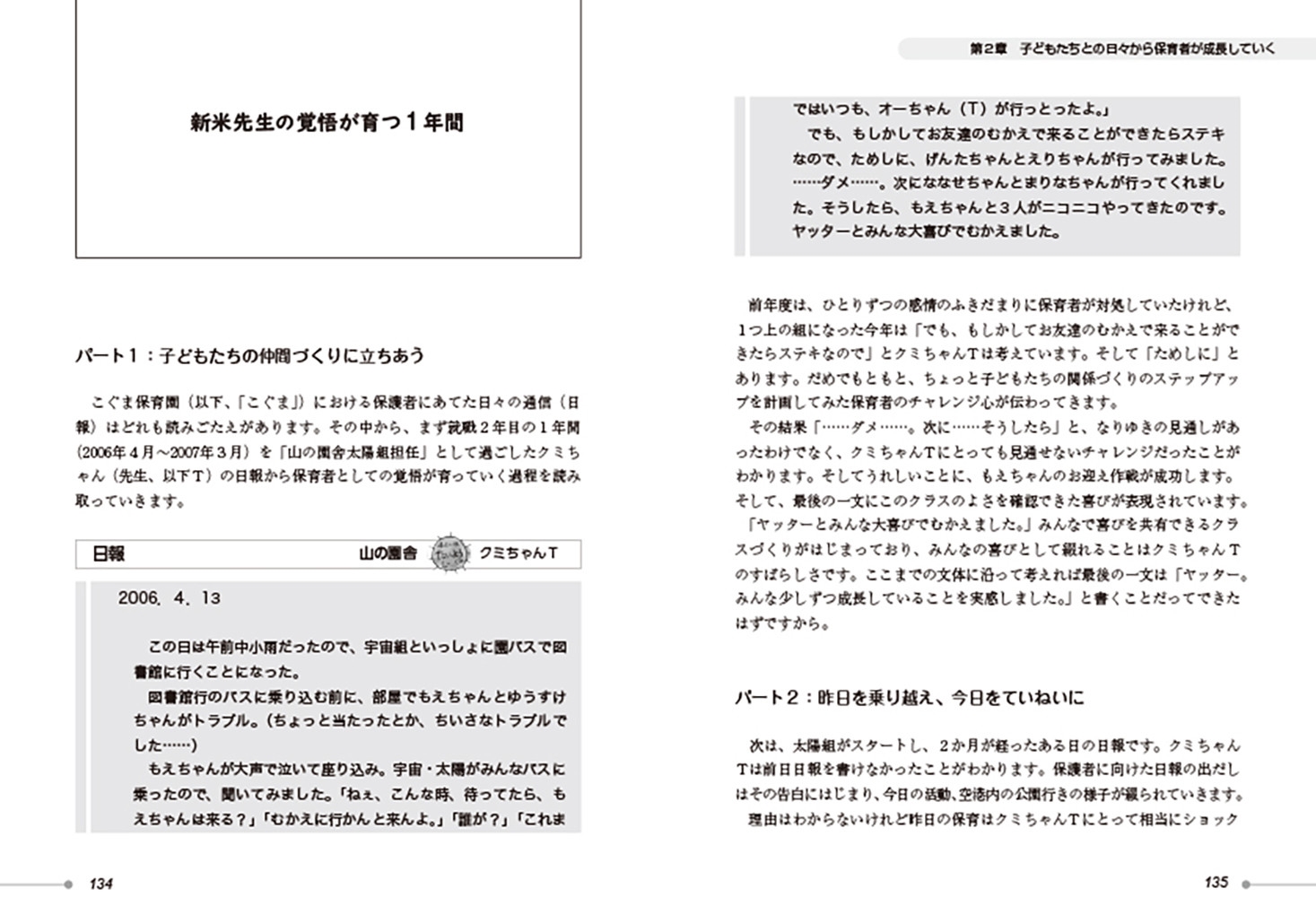 また、保育や保育記録における本当の物語とは何か、児童文学の世界に身を置く著者(村中李衣)の視点から考察。