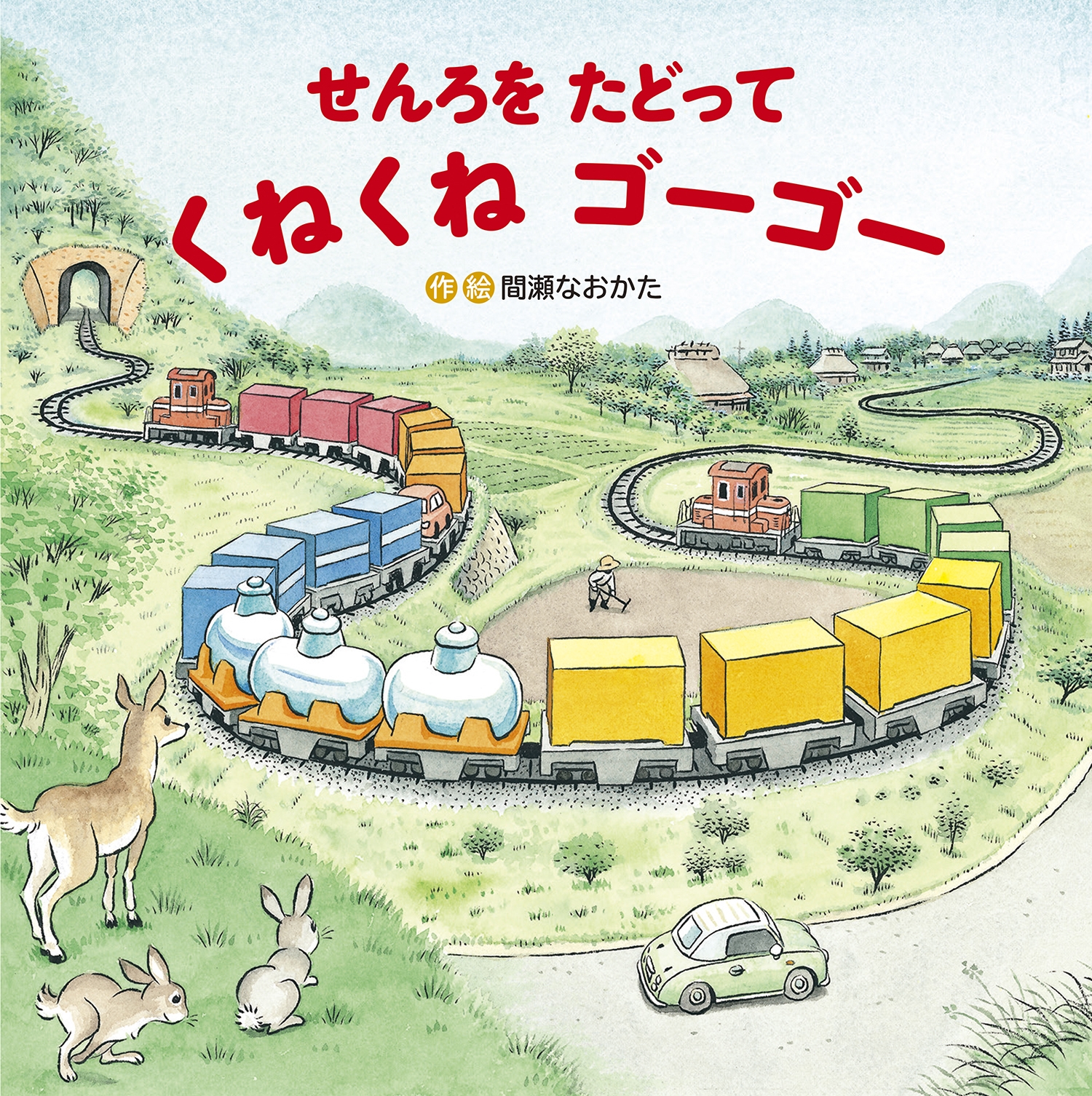 間瀬さんの乗り物しかけ絵本初登場となる貨物列車。今回のお話に登場する貨物列車は、くねくね町貨物駅と、くねくね村貨物駅の間を走ります。前後どちらの駅からも読むことができますので、ぜひ線路を指でたどりながら何度も楽しんでみてくださいね。