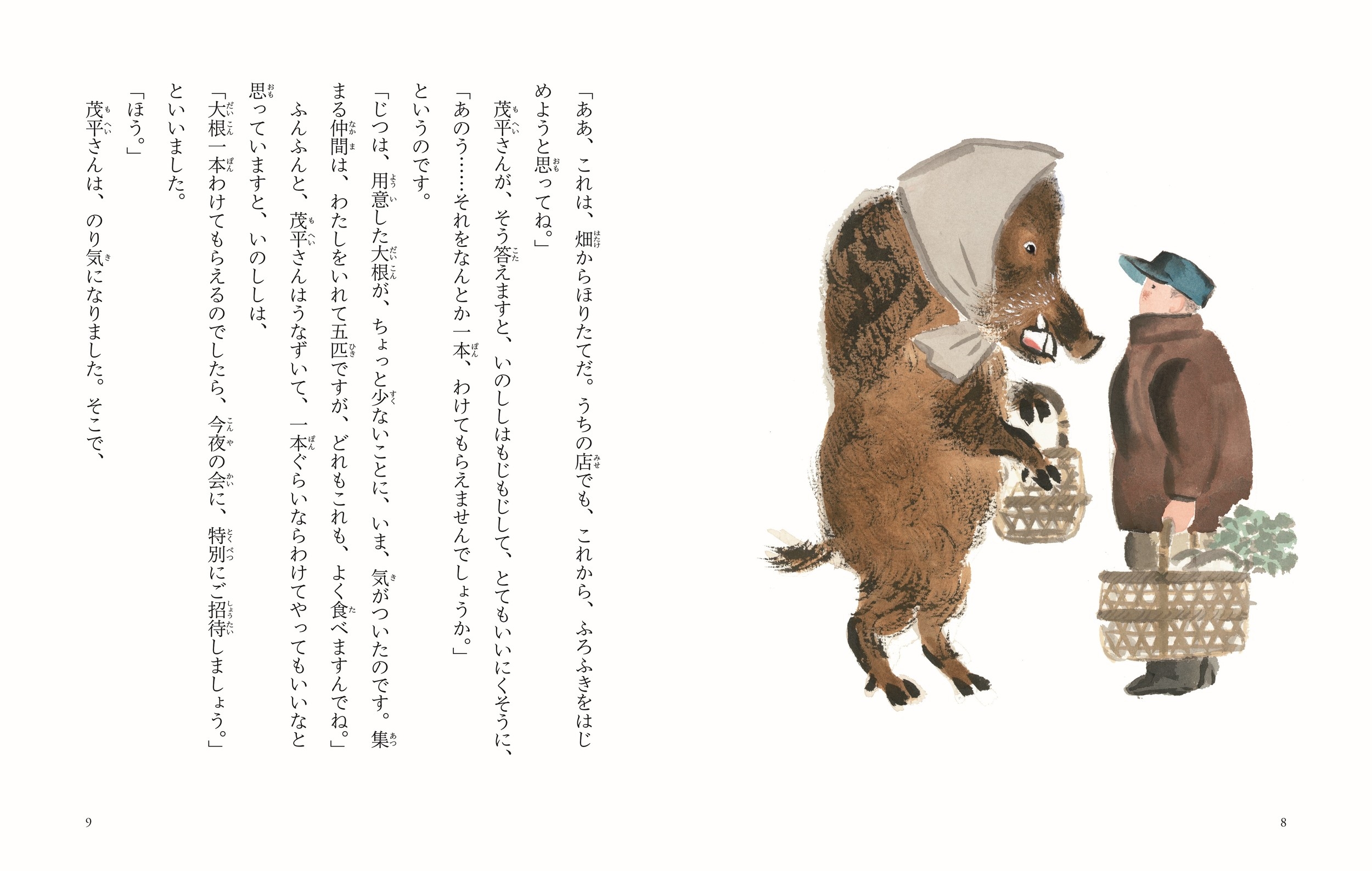 さむいさむい夕ぐれどき、峠の茶店の茂平さんは、山道で出会ったふしぎなイノシシにほりたての大根をわけてあげました。するとその晩……。