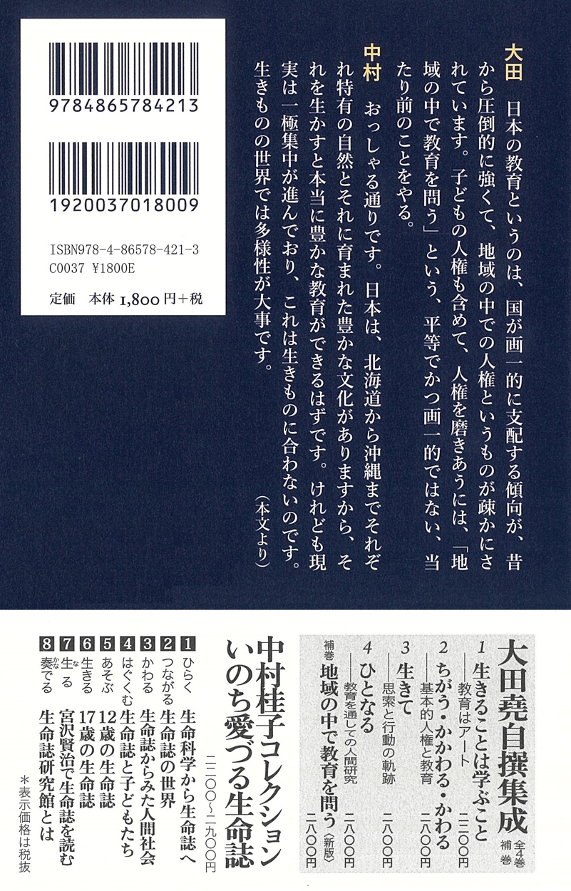生命(いのち)の視点から教育を考えてきた大田堯さんと、40億年の生きものの歴史から、生命・人間・自然の大切さを学びとってきた中村桂子さん。教育が「上から下へ教えさとす」ことから、「自発的な学びを助ける」ことへ、「ひとづくり」ではなく「ひとなる」を目指すことに希望を託す。