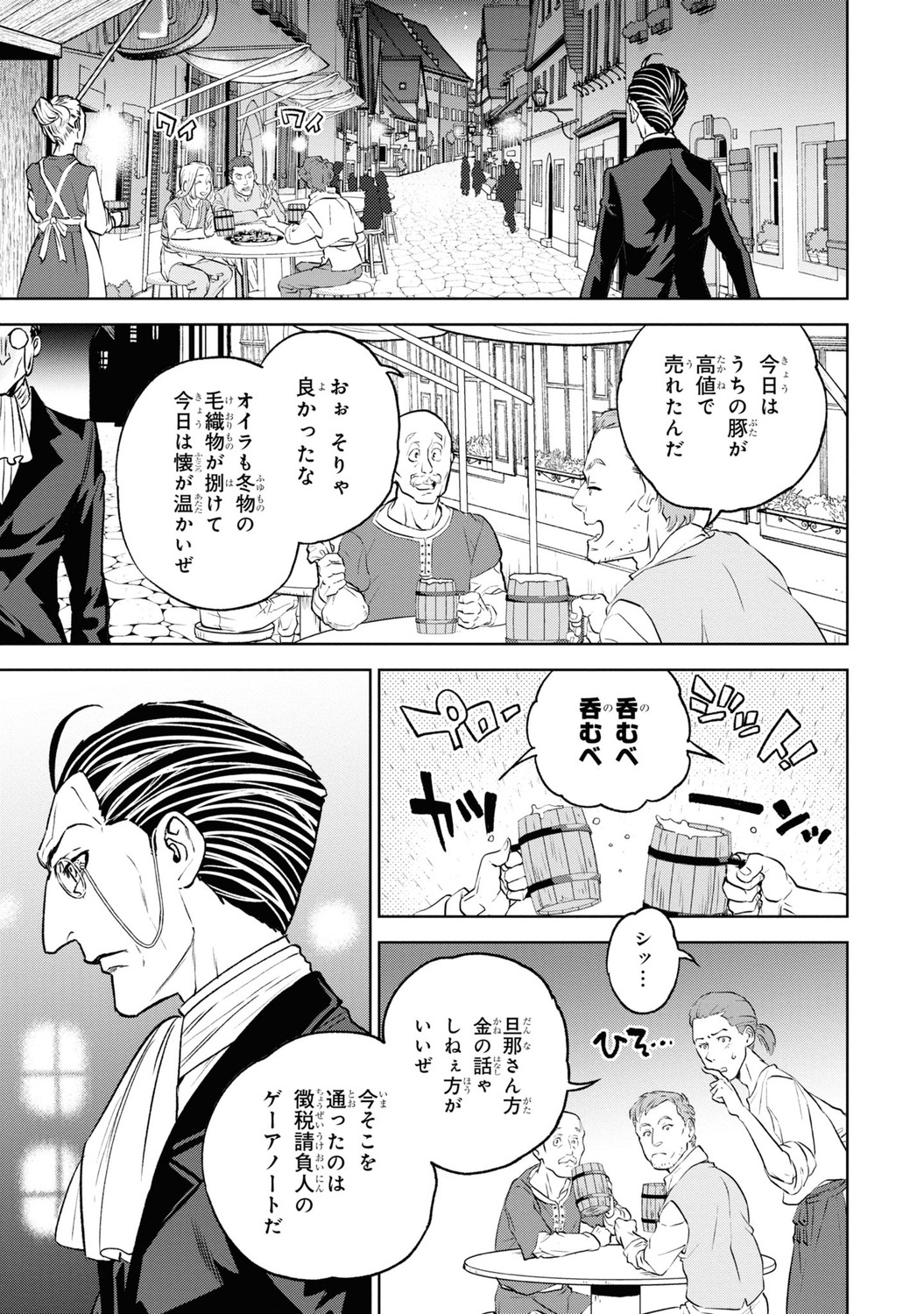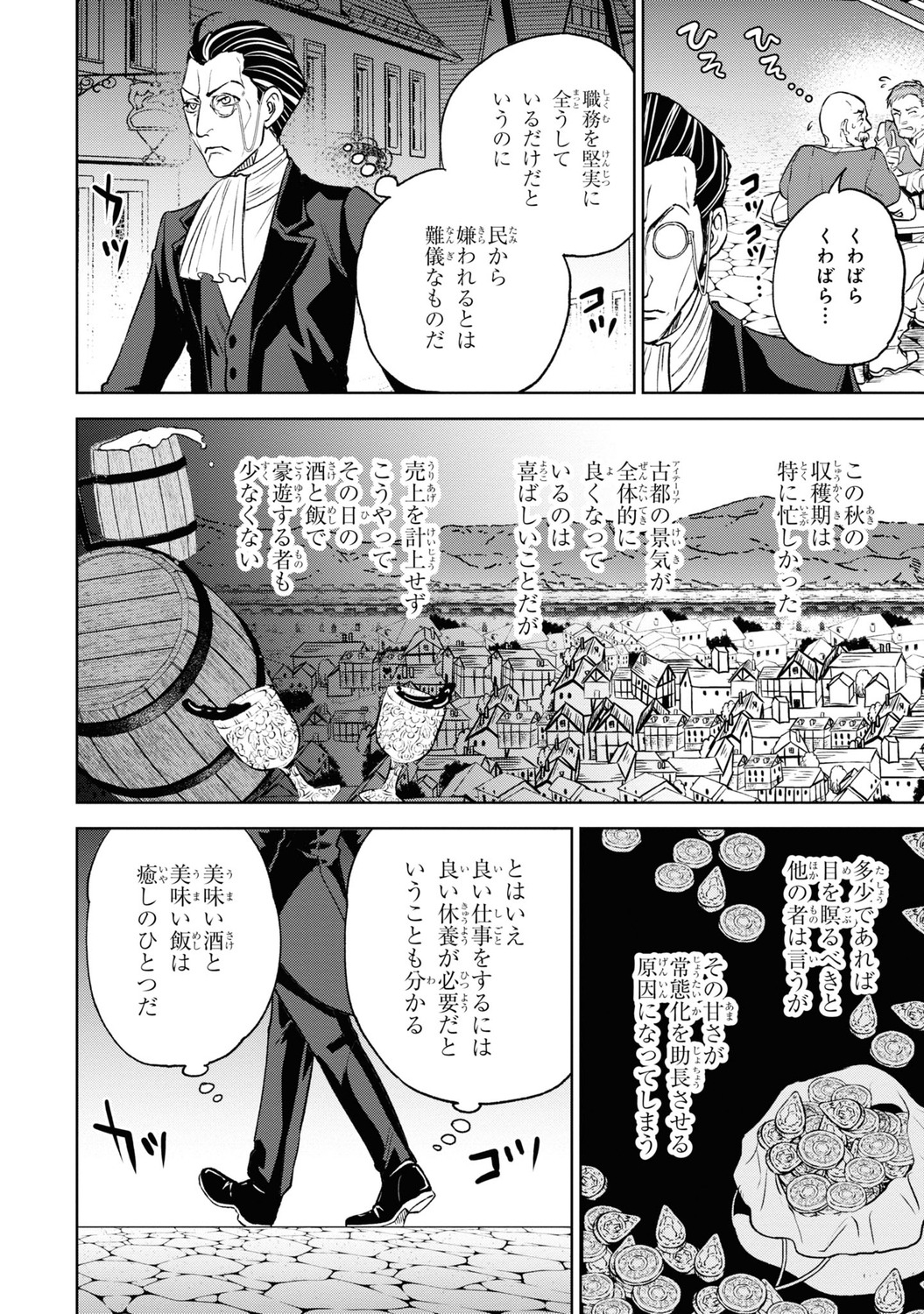 徴税請負人・ゲーアノートは居酒屋「のぶ」で、自身と同じ徴税請負人組合の者達と遭遇する。彼らから、新しく来る請負人の監視役──"勅任監察官"に関する相談を受けて…。大人気グルメファンタジー18巻!