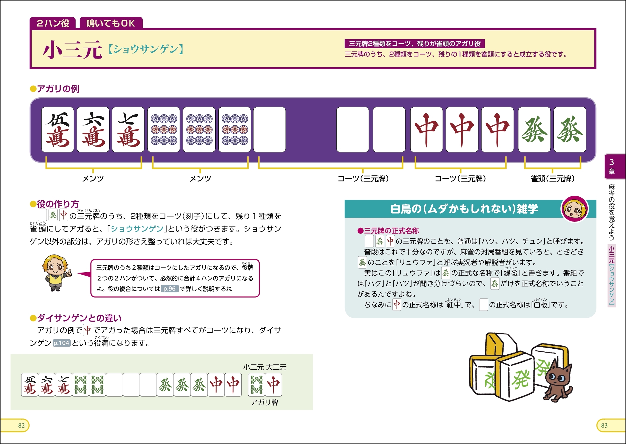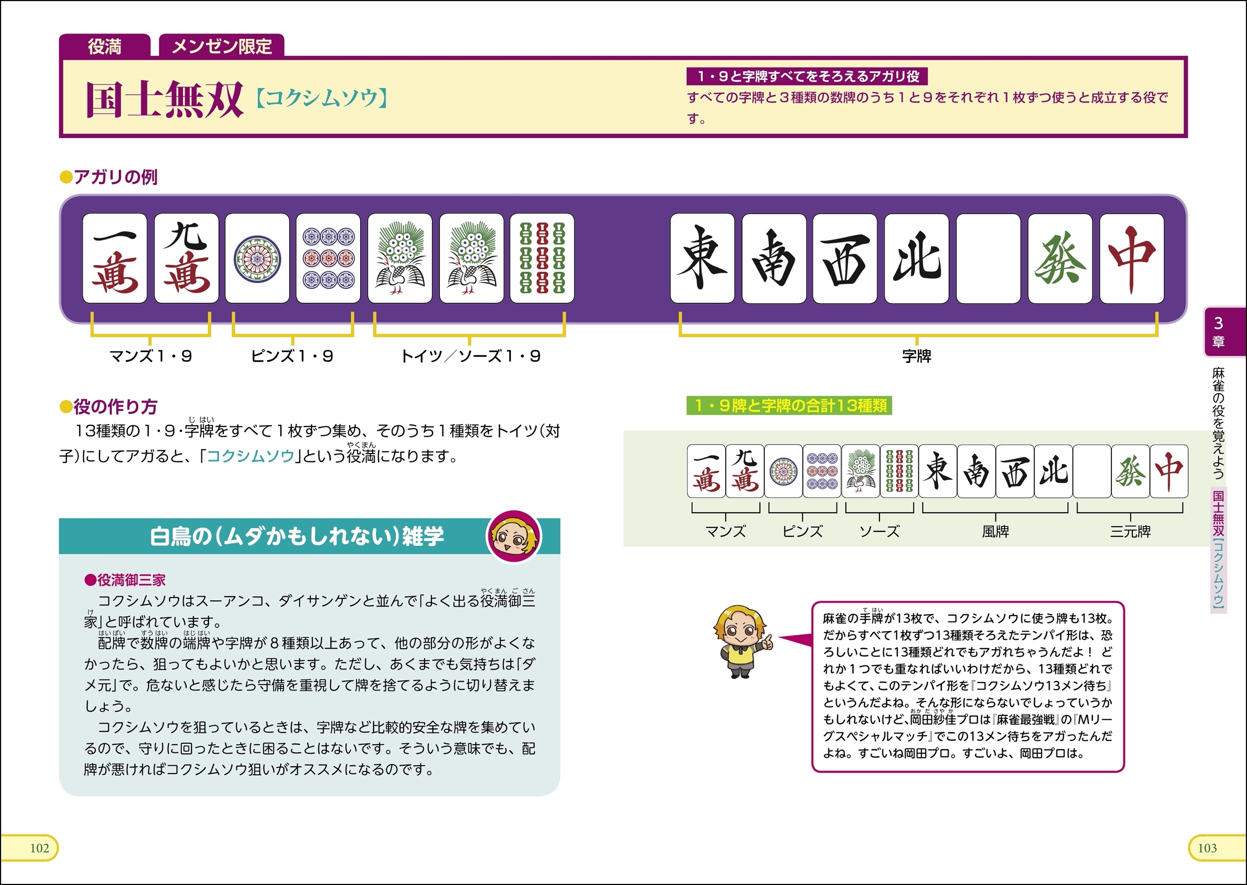 人気Mリーガー・白鳥翔氏がナビゲートする麻雀の入門書。これから麻雀をはじめようという人のために、とにかくわかりやすく解説しています。座り順の決め方から、親と子の関係、ツモり順といったごくごく基本のことから、役の紹介、実際のゲームの進め方、あがり方まで、初心者でもわかりように解説しています。