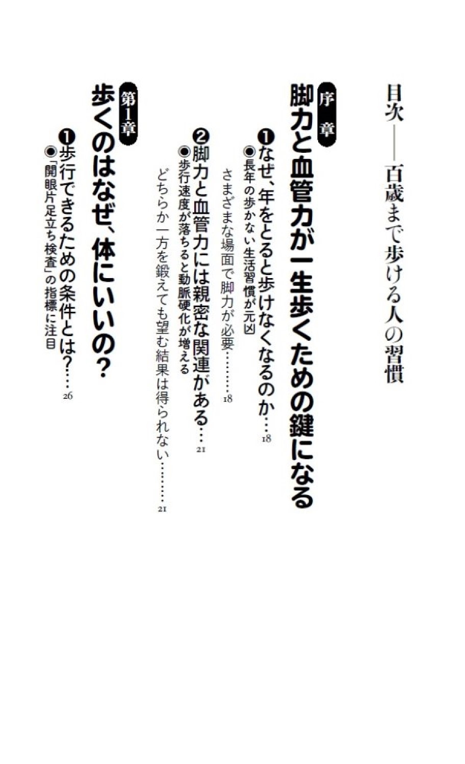 抗加齢医学研究に長年携わってきた著者は、歩くための力には「脚力」と「血管力」があるという。本書は、百歳まで歩ける人になるために、脚力と血管力を鍛えるエクササイズや、ウォーキング事例を紹介する。