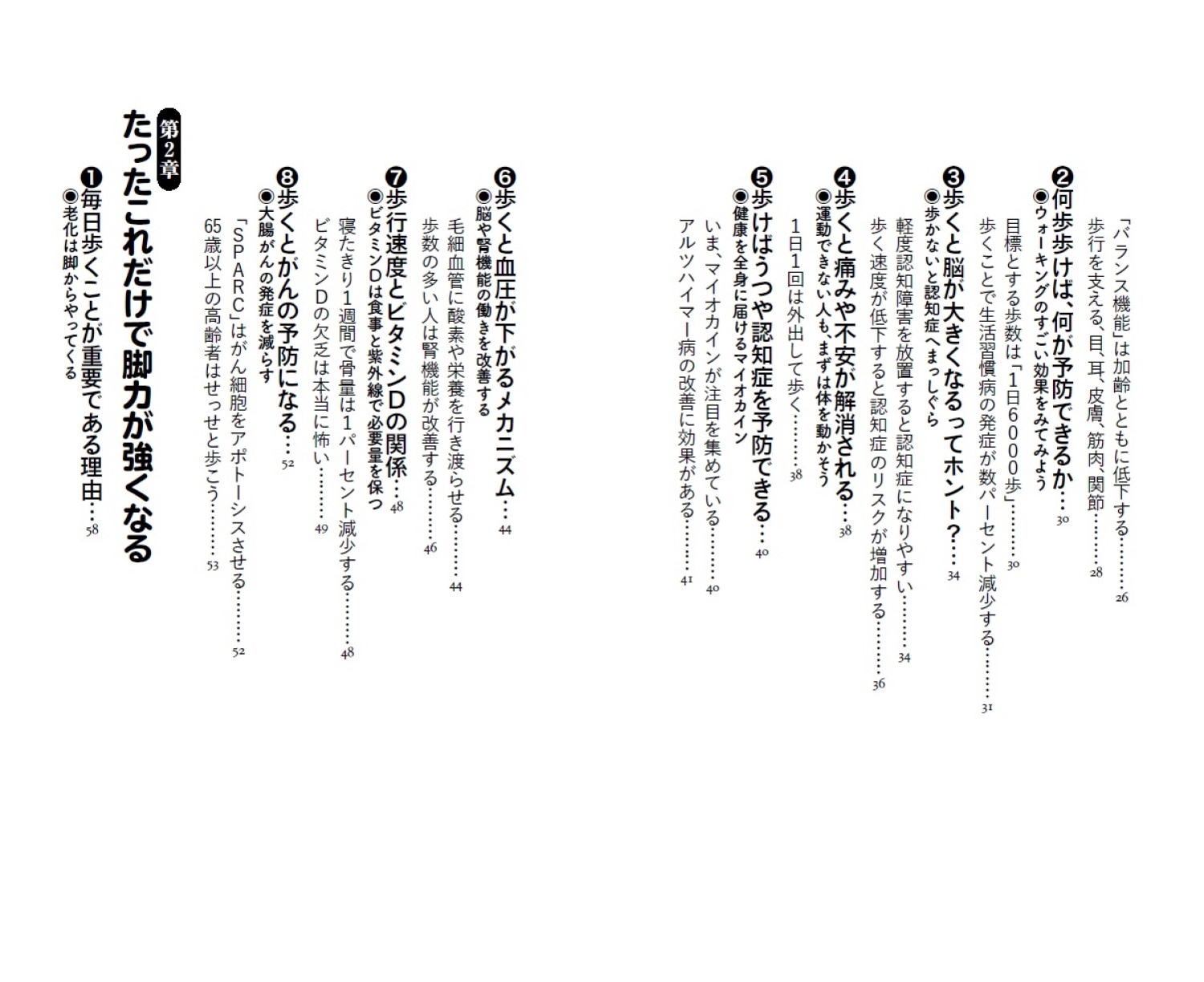 ウォーキングについては、著者が考案した「ニコニコ歩き」のほか、「インターバル速歩」「パワーウォーキング」「俳句ウォーキング」などを解説している。