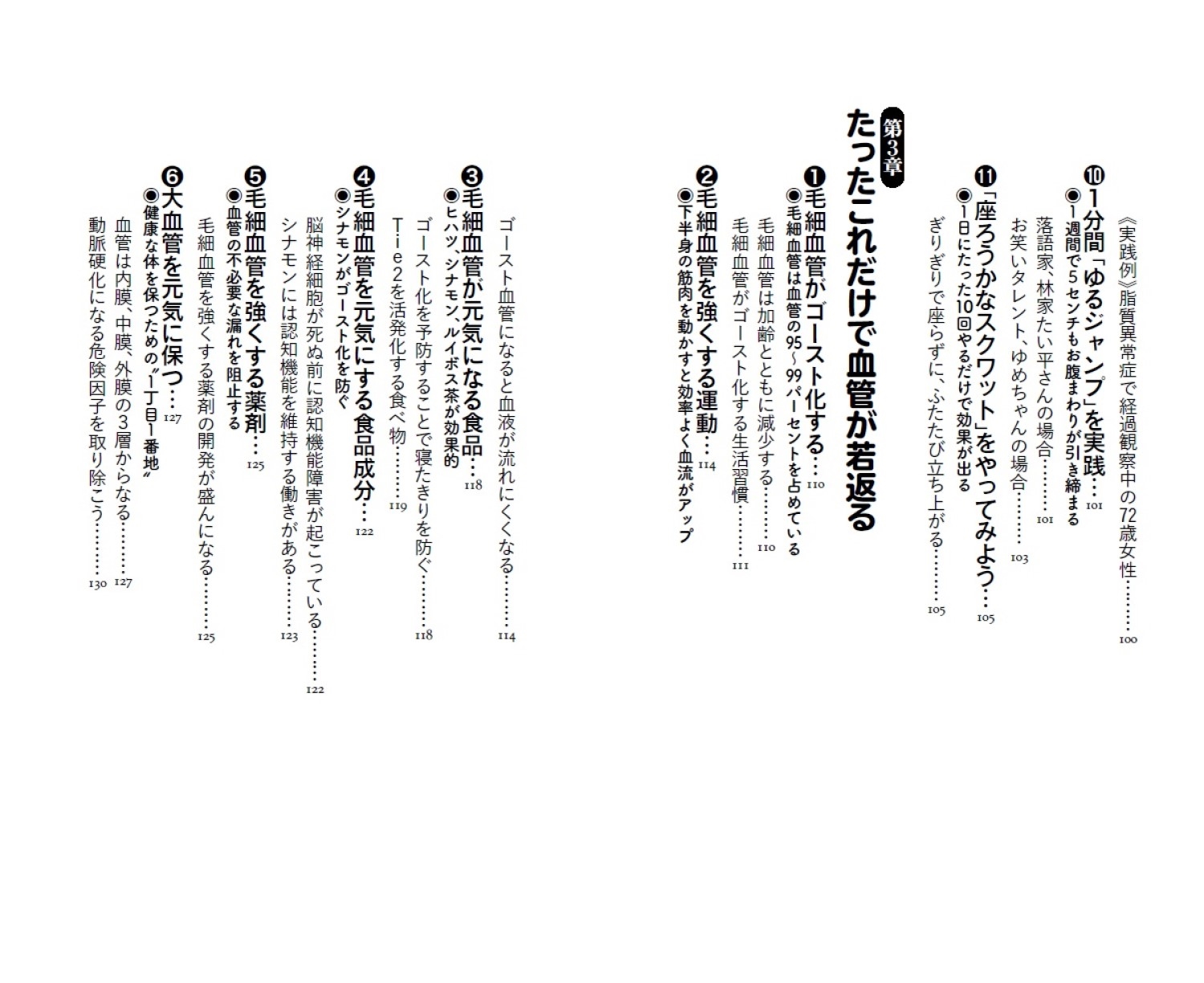 血管力については、ヒハツ、シナモン、ルイボス茶などを摂って毛細血管を強くすること、ニンニク、ナッツなどを摂ったり、ウォーキングや軽いサイクリング、エアロビクスなどの有酸素運動をしたりして大血管を強くすること、などを推奨している。