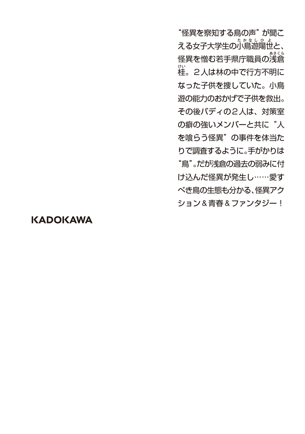 手がかりは野鳥たちの"警告"。怪異アクション&ファンタジー&ホラー&ミステリー!