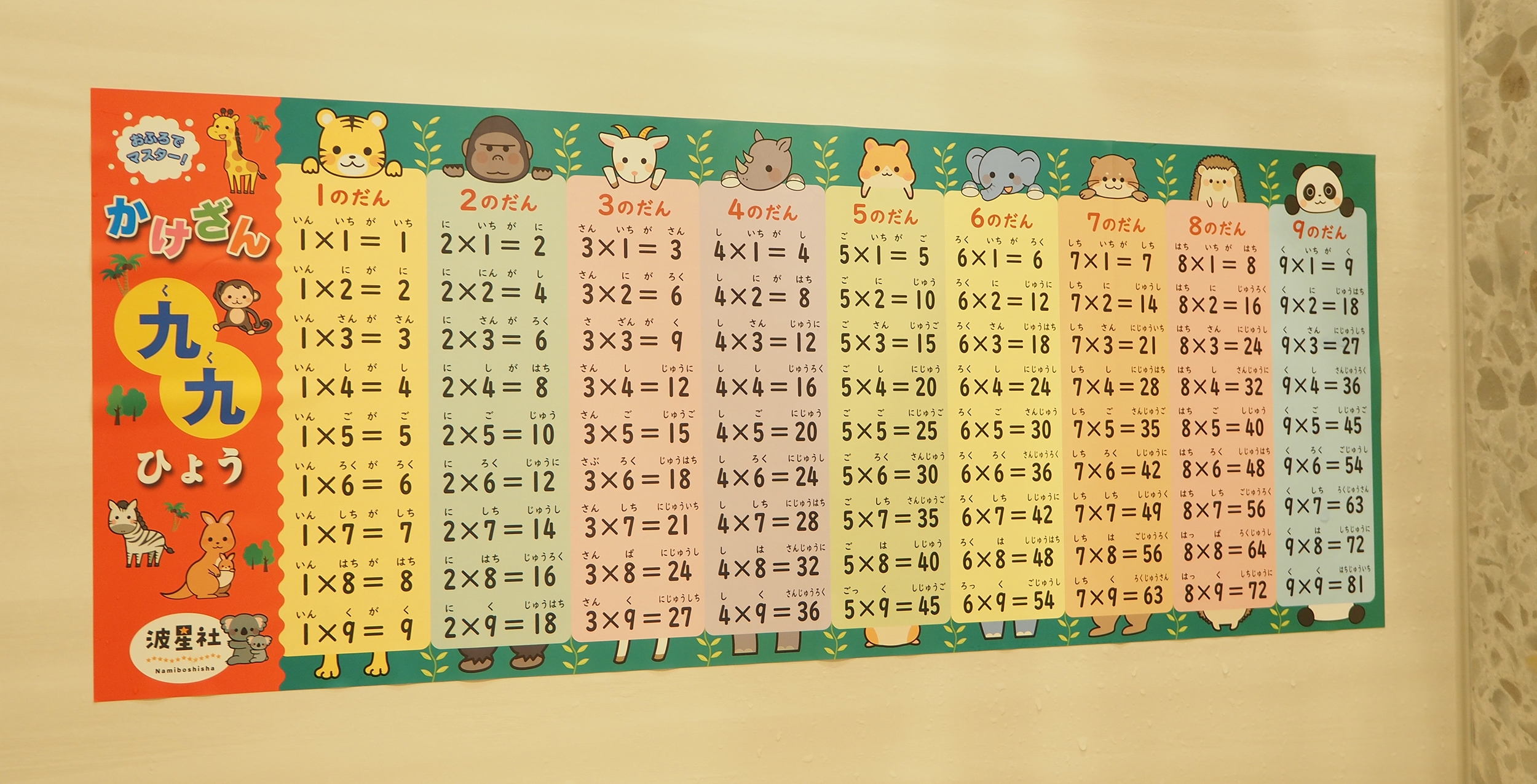 大きめの文字でわかりやすく、かわいい動物のイラストと組み合わせることでお子さまの興味を引き、楽しみながら九九を覚えられます。また、読み方も記載しており九九の暗唱練習に最適な九九表です。