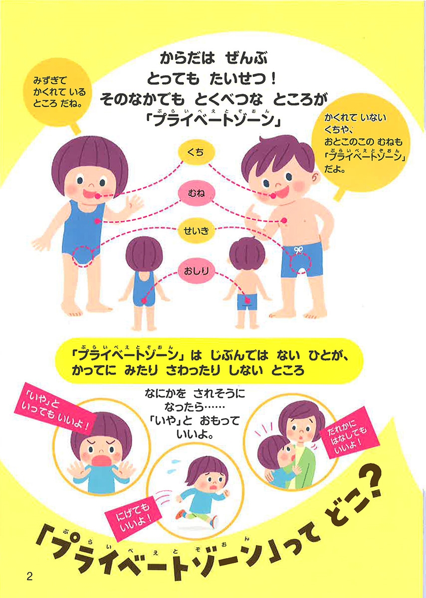 自分の体は自分のもの、性器の名称や洗い方など、かわいいイラストとわかりやすい図解で、親子で一緒に見て理解できる。