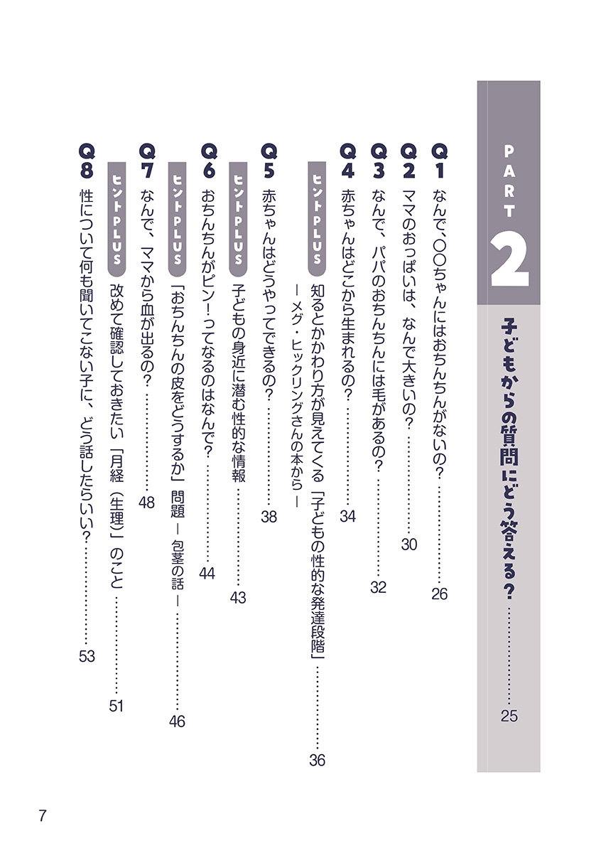 「性器いじりにはどう対応したらいい?」「子どもとキスしちゃダメ?」「男の子同士で性器を見せ合っていたらどうしたらいい?」「性器を触られたと子どもが言ってきた」「子どもおおしりをふくのはいつまで?」…など、ママ友や周囲に相談しづらい内容や、「外出先で、子どもが1人でトイレに行っても大丈夫?」といった、施設での性被害(男女)を防ぐためのアドバイスなど。