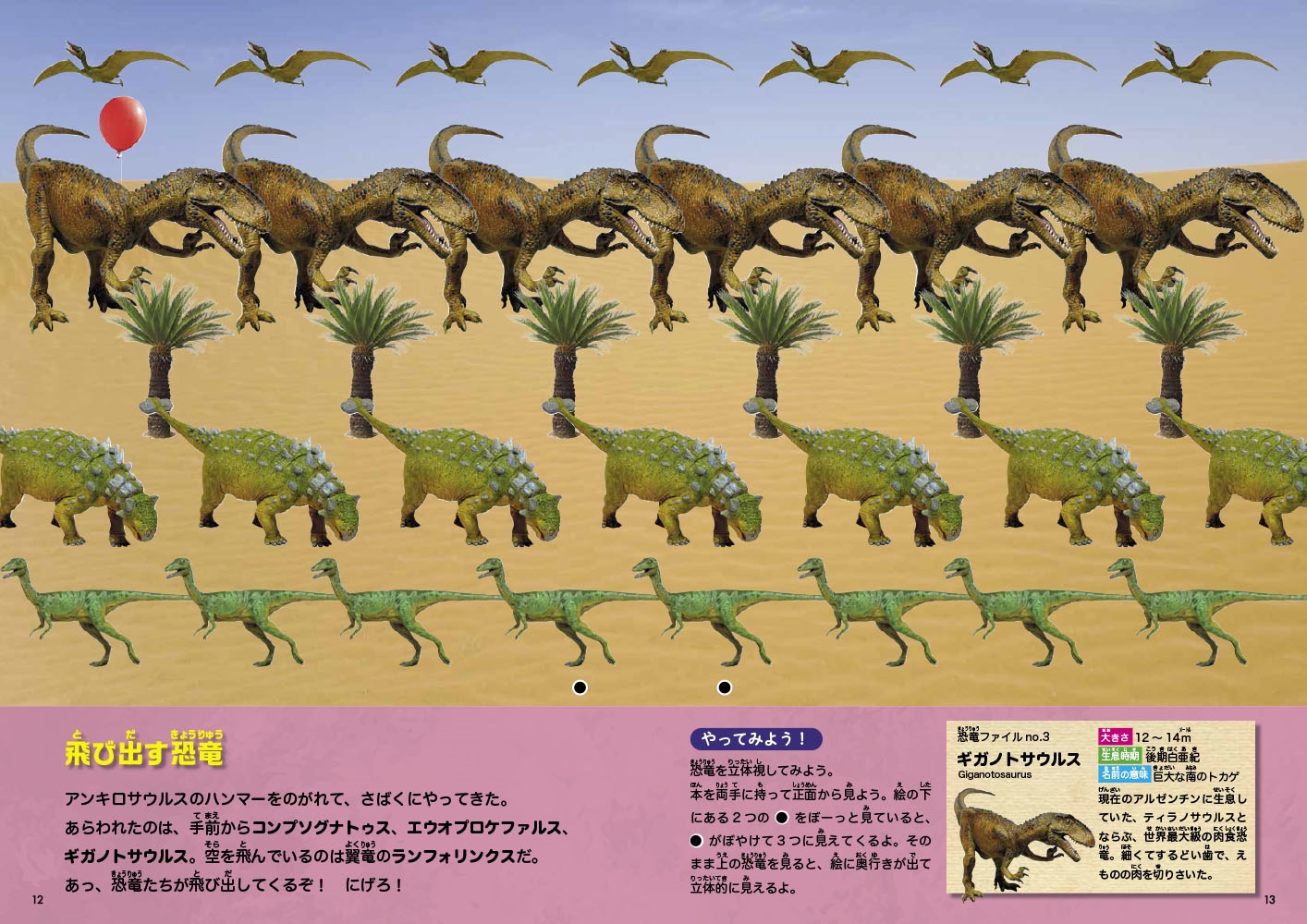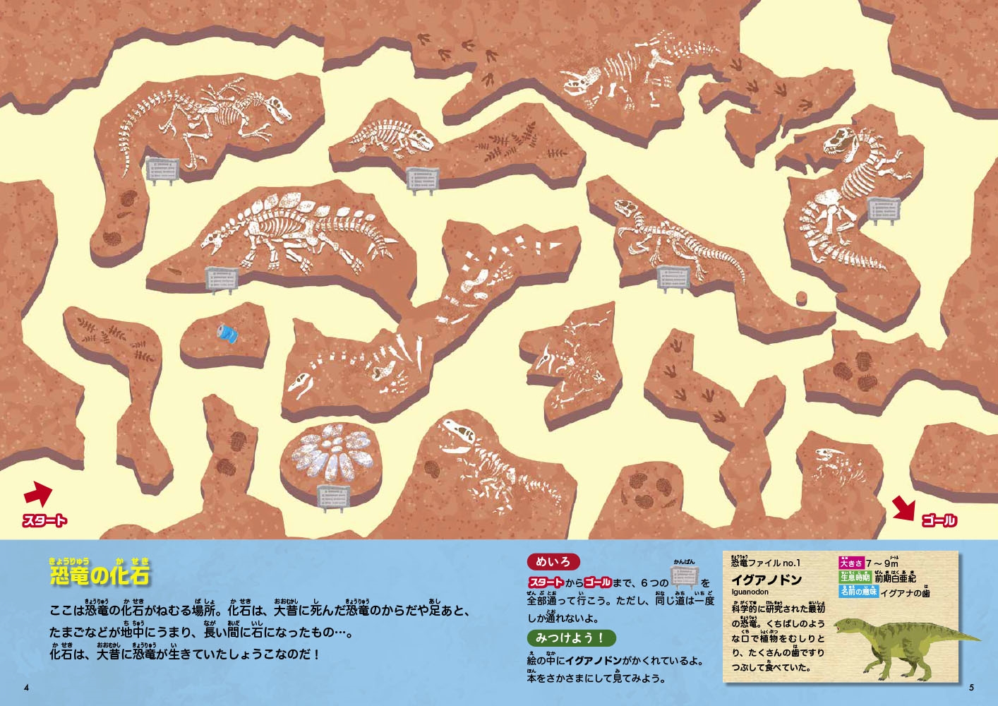 化石の発掘現場で、なにか怪しい気配が? なぞの閃光が走り、周囲の化石が揺れ動きだした!! 発掘現場にいたはずなのに、気がつくとキミたちがいたのは、恐竜が群れをなし闊歩している草原。いったいここはどこ? もとの場所にもどれる? めいろや、だまし絵、隠し絵、錯視、絵さがし、まちがいさがしなどで遊びながら、恐竜が生きている草原、砂漠、川、海、空などを進もう! 恐竜の豆知識コラム付き!