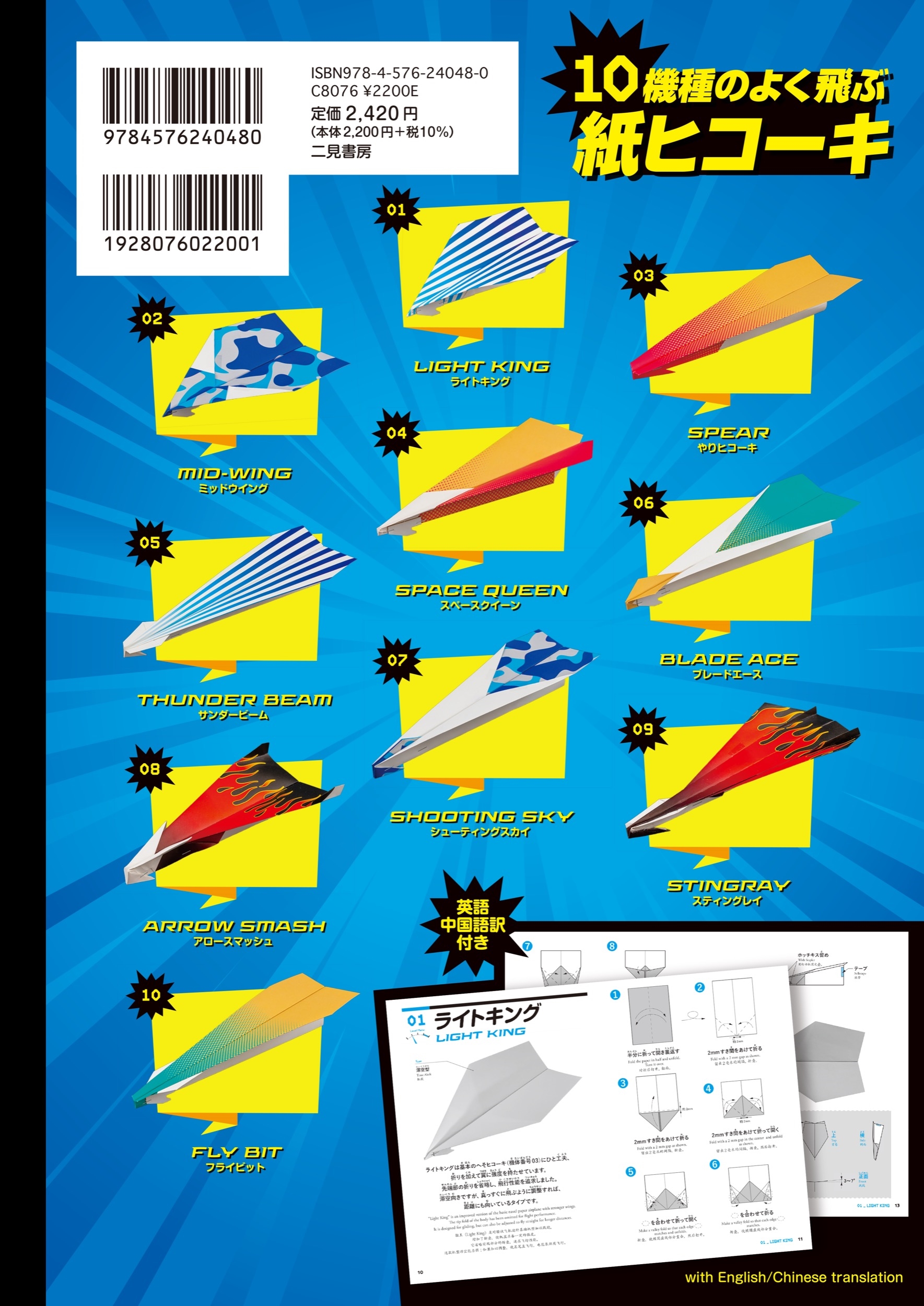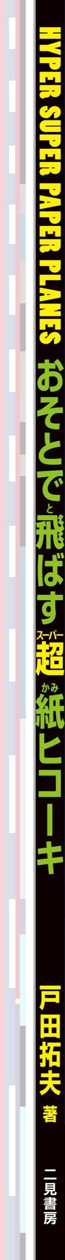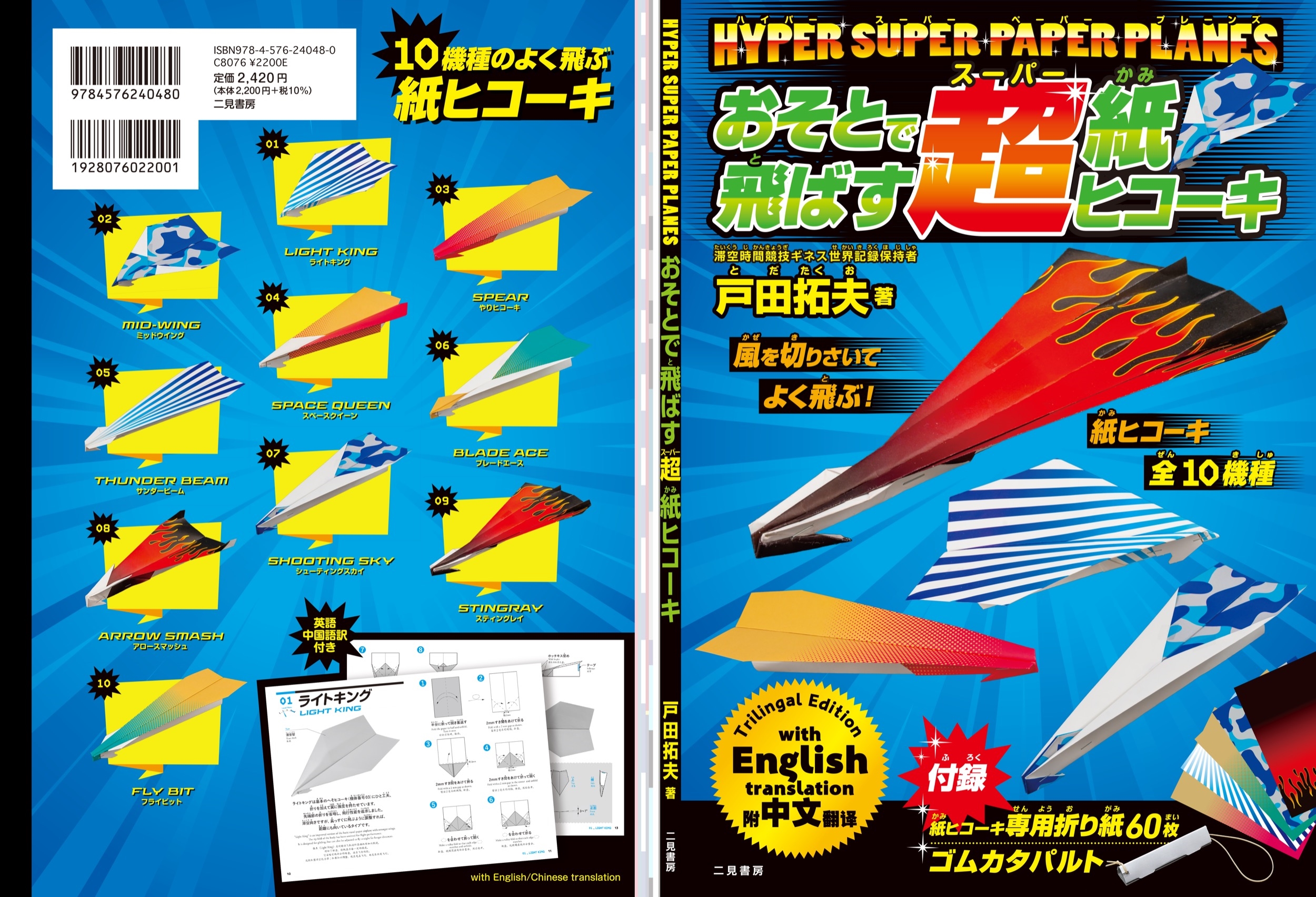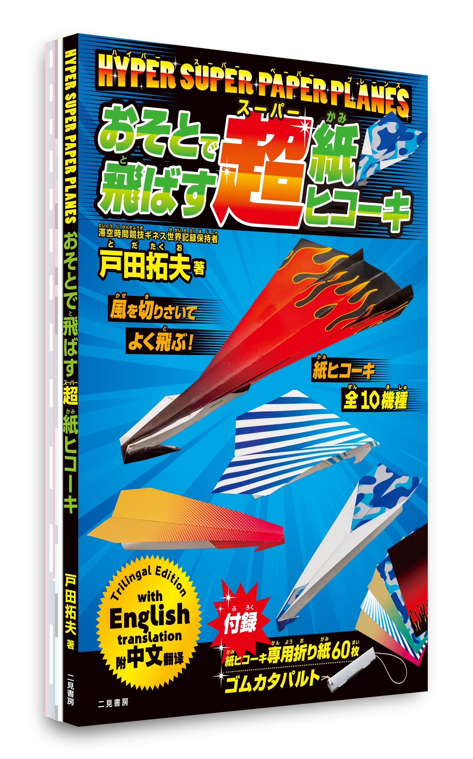 前著『おうちで紙ヒコーキ』と同じく折り紙飛行機を全10機種を設計して掲載。外で飛ばしてもらおうというものです。外で飛ばすため、厚紙によるカタパルトと、輪ゴムよりも強力な競技用糸ゴム、そして専用の色紙を付録としました。折り紙飛行機としては、格好良く、とても飛行能力の高いものばかりです。