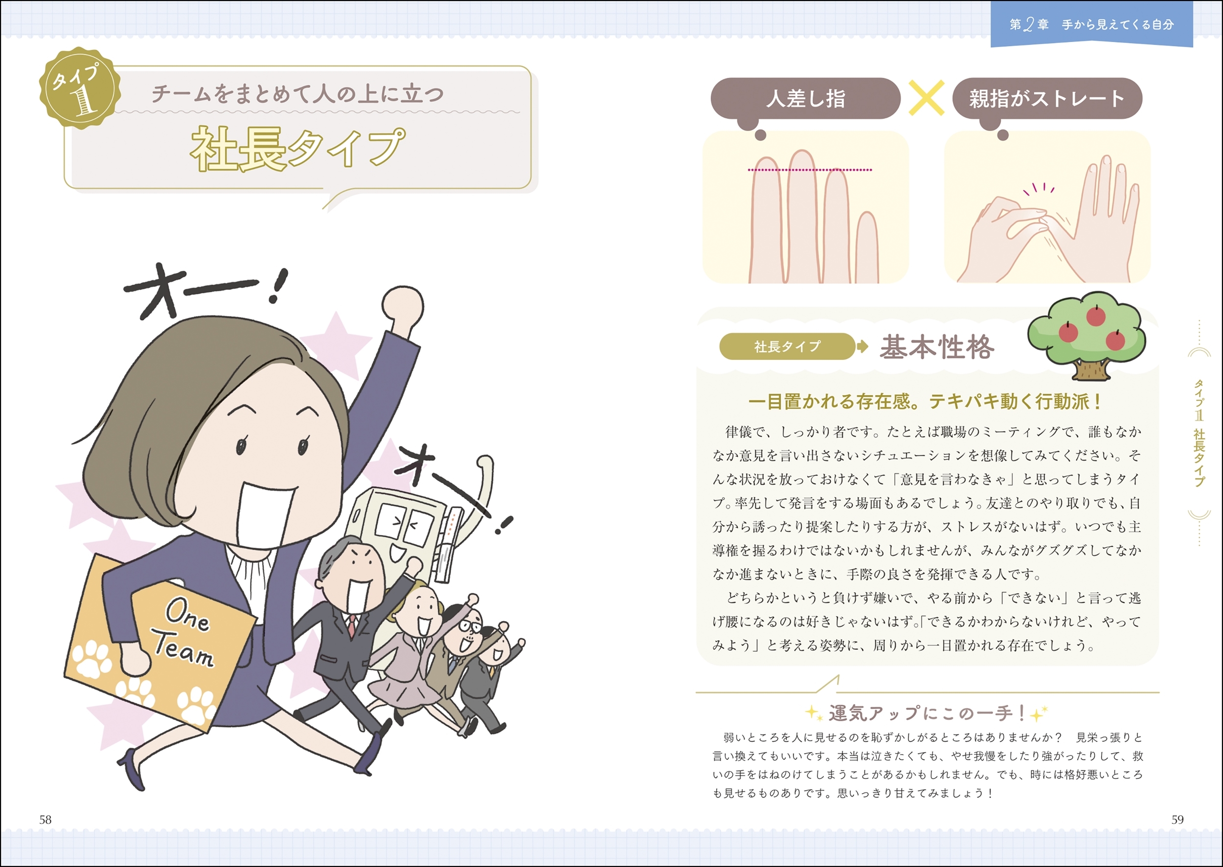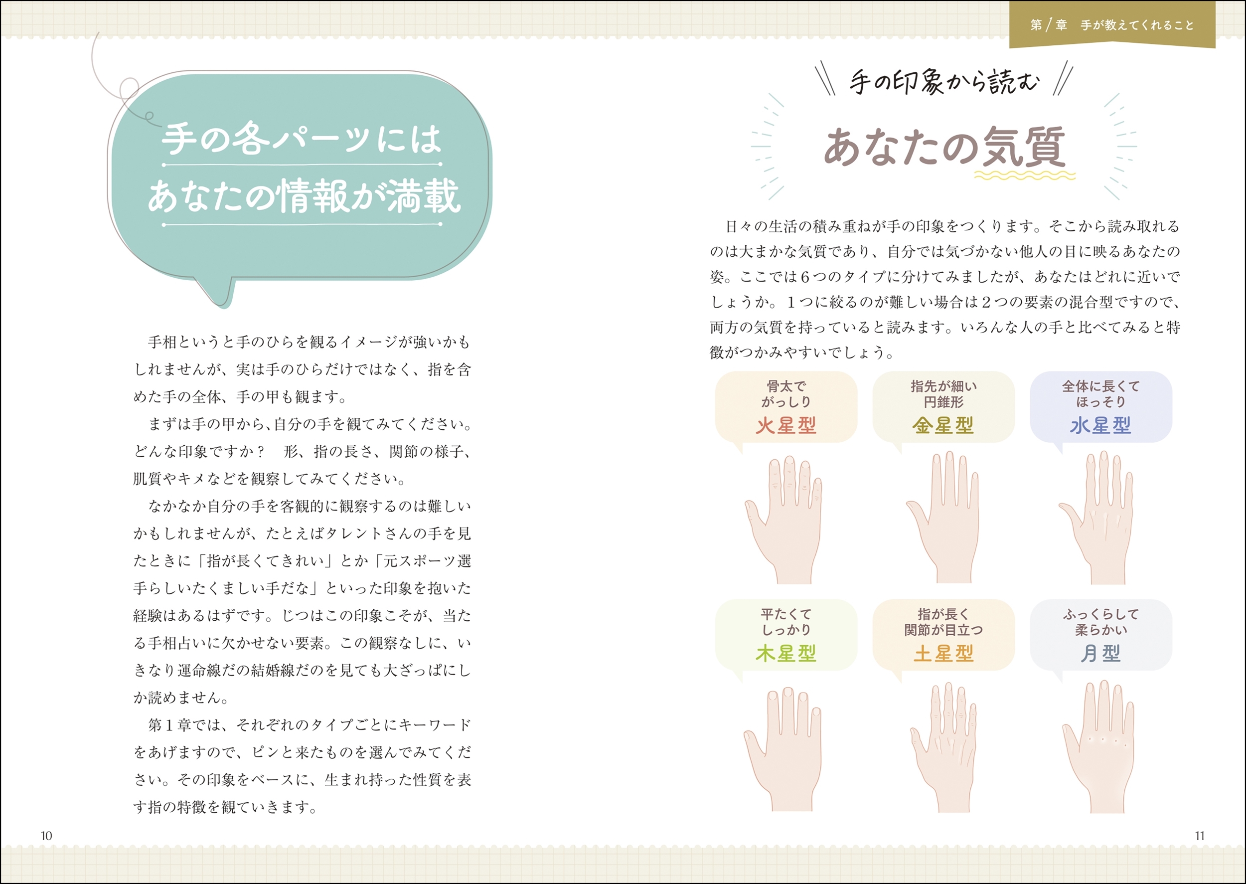 手全体の印象からタイプを知ったうえで、いよいよ線を観ていきます。本書では感情線、頭脳線、生命線の基本線に、運命線を加えた四大線を中心に、さまざまな運を示す複線、吉凶が現れる「お宝サイン」を解説しました。それぞれの線について、どこをみればいいのか、ポイントを詳しく解説していますので、迷わず判断することができます。さらに、実際の手相写真をみながら鑑定を学べるケーススタディもあります。本書で自分の手相をみながら、幸せになる方法を探してみてください。