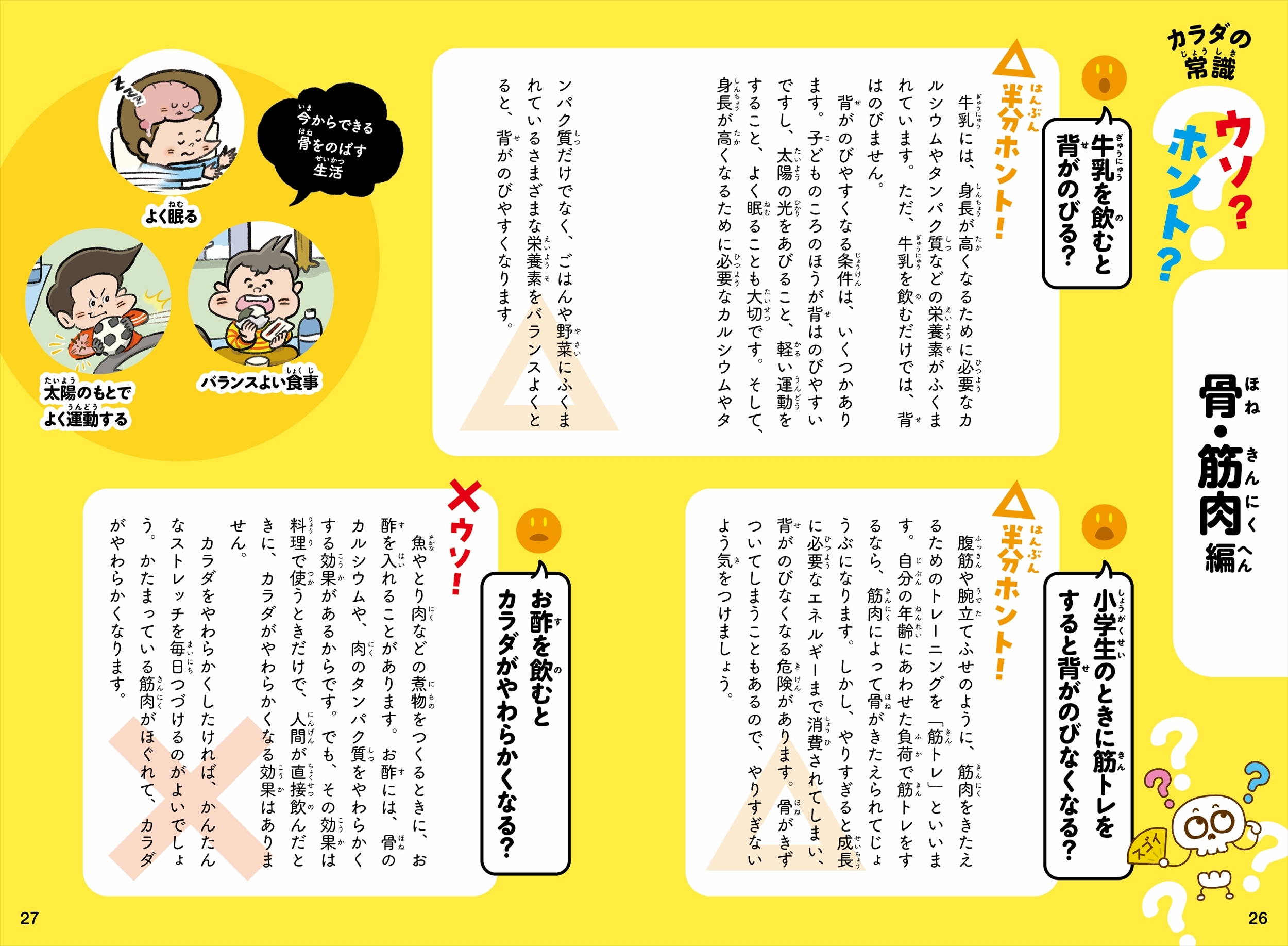 食べ物が口から入って、消化されてうんちとしてカラダの外に出るまでの道のりで起こっていること、ウイルス・細菌などからカラダをまもるはたらき、カラダを動かすために骨や筋肉が連動していることなど、知れば知るほど面白いことばかり。