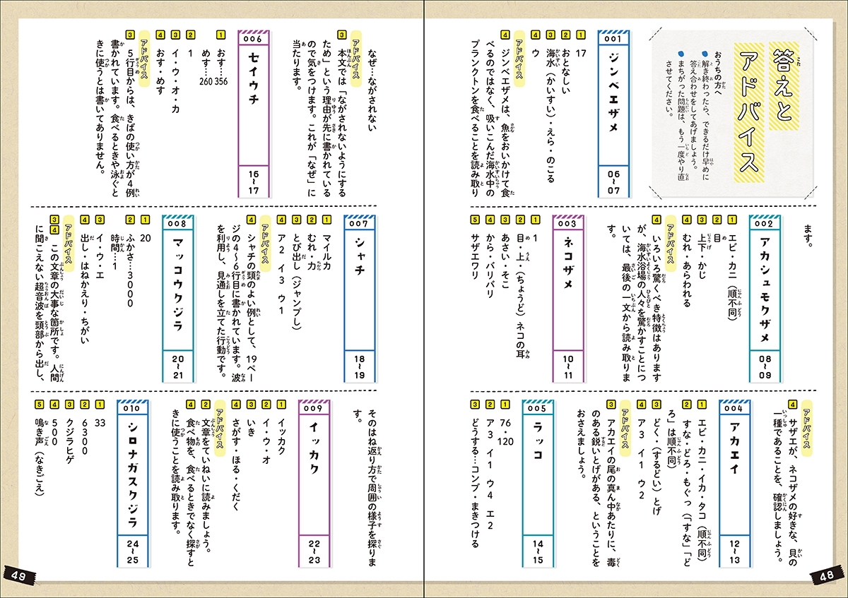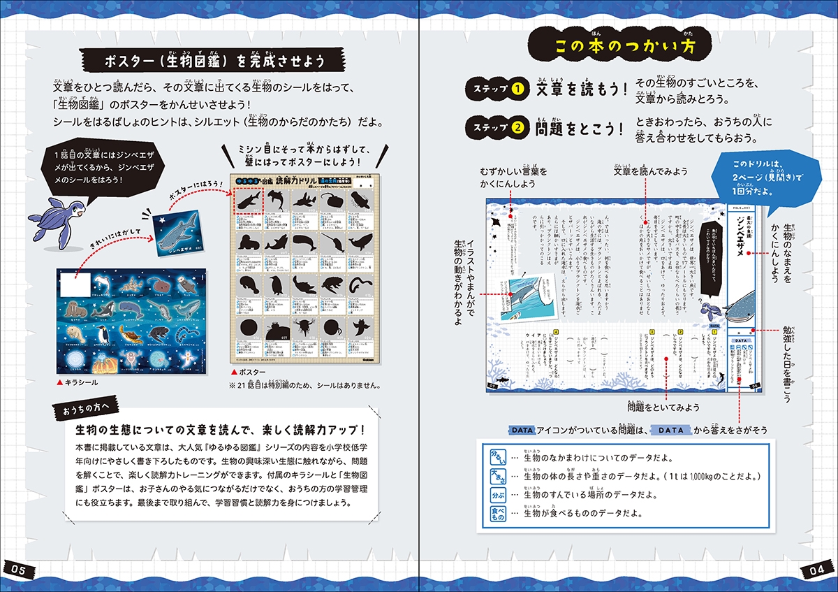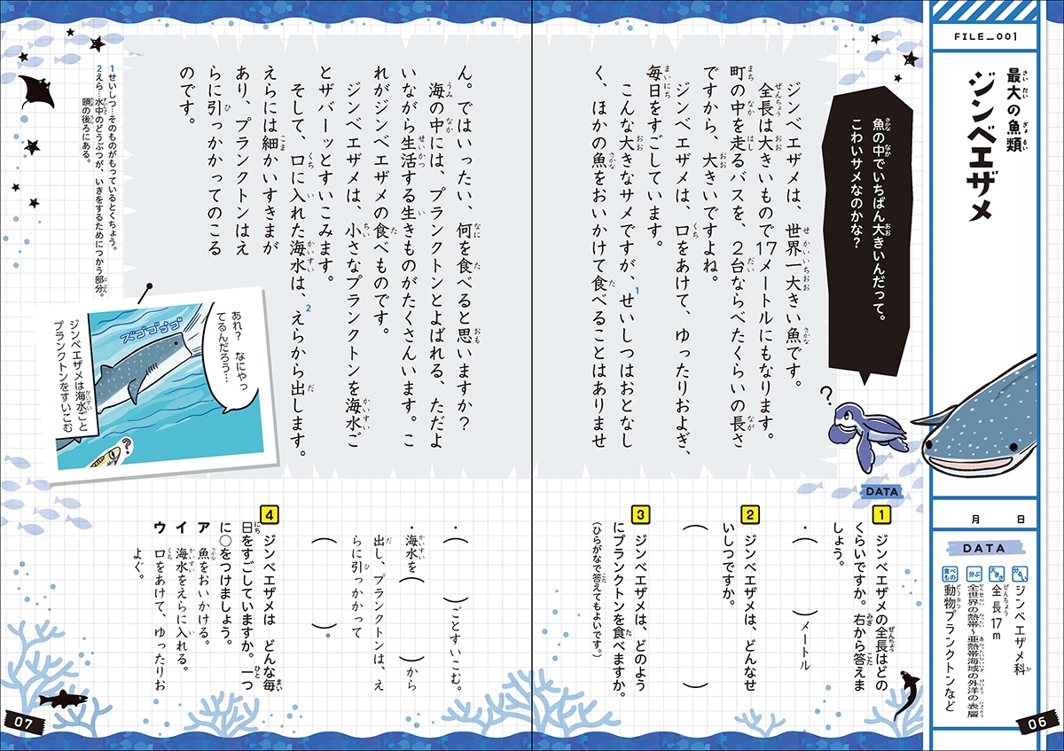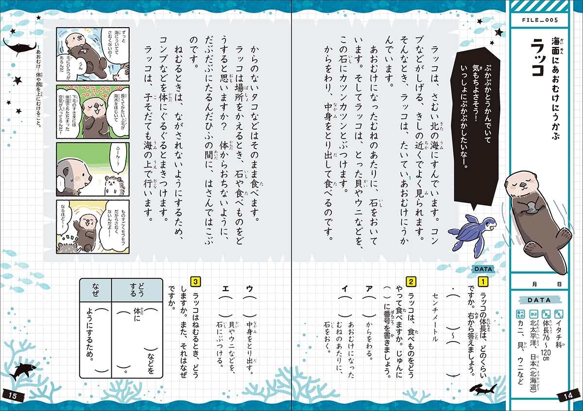 サメ、ラッコやアザラシ、ペンギン、クラゲやクリオネまで、子どもたちに人気な全20種の生物たちの生態についての文章を読むことで、読解力が身につく。