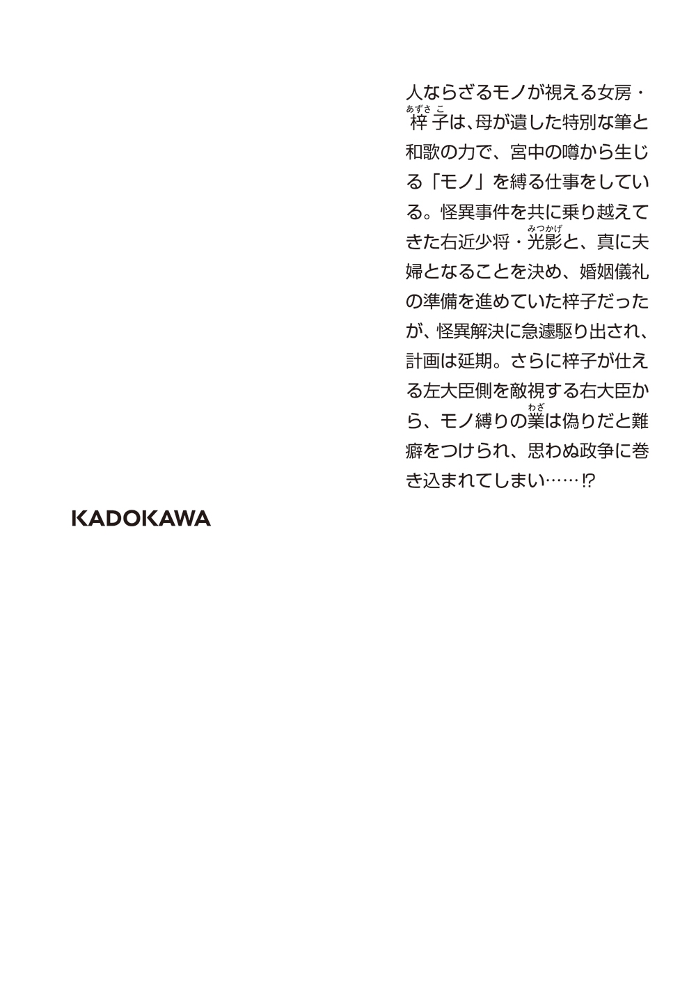 生まれつき人ならざるモノが視える女房・梓子は、亡き母が遺した特別な筆と歌徳の宿る高名な和歌の力を借りて、宮中の噂から生じる怪異的な「モノ」を縛る仕事をしている。
