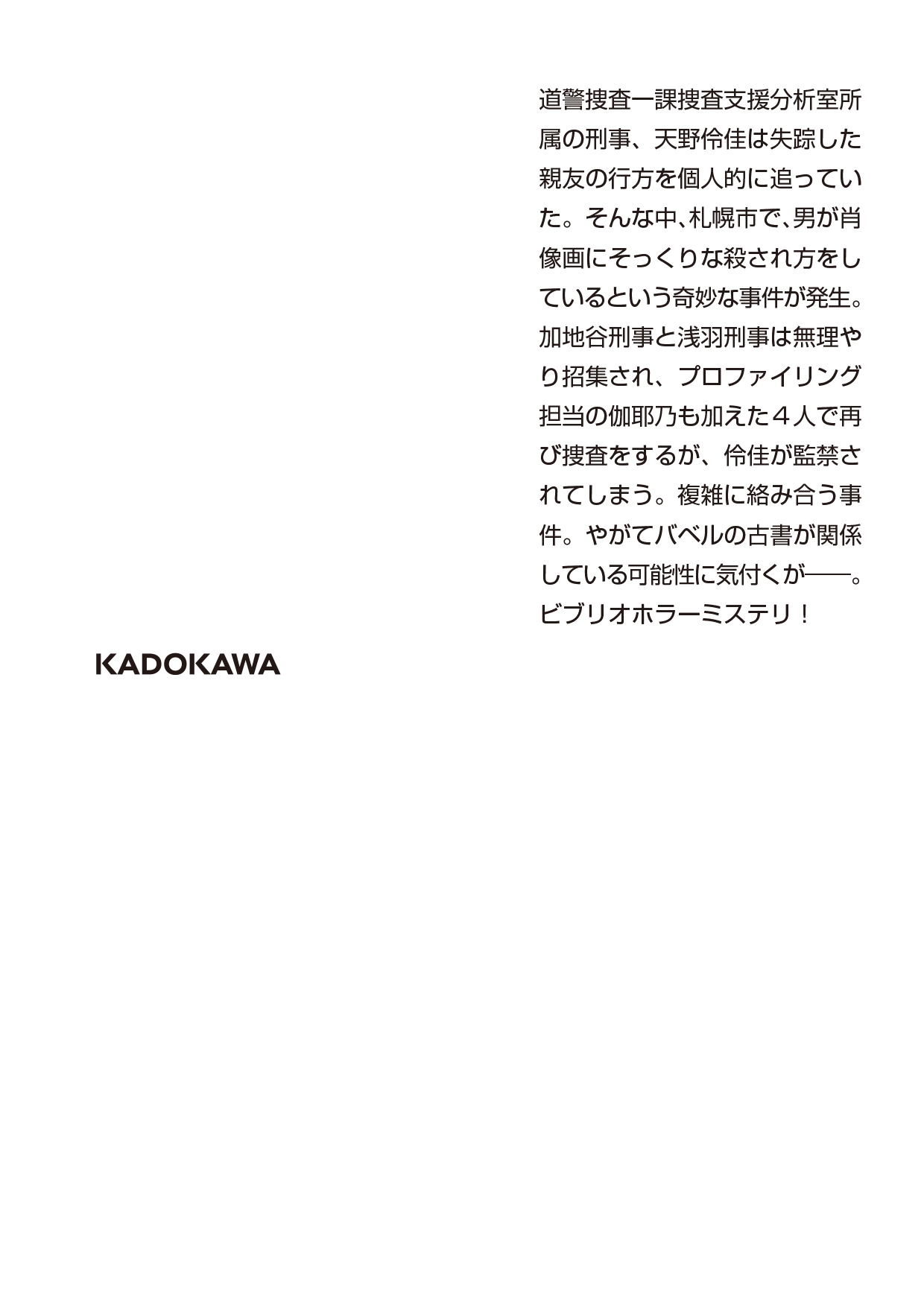 高校時代からの親友が行方不明になり、独自に行方を探そうとする道警捜査一課捜査支援分析室所属の刑事、天野伶佳。そんな中、札幌市で殺人事件が発生する。被害者は『死に顔を描いた不気味な肖像画』の通りに殺害されており、第一発見者である被害者の友人は、現場から立ち去っていく犯人らしき人物を目撃していた。その人物は、かつての友人に酷似していたのだが、数十年前と変わらぬ若々しい容姿だったという。それはオスカー・ワイルドの『ドリアン・グレイの肖像』を彷彿とさせる奇妙な事件だった。この事件の捜査を伶佳が担当。加地谷と浅羽の二人は無理やり招集され、プロファイリング担当の伽耶乃も加えた四人で再び捜査をすることに。ところが捜査中、伶佳が何者かに監禁されてしまう。はたしてそこにいたのは――。そして伶佳を救出のため駆け付けた加地谷たちが見たのは、またもや『BABEL』の刻印が押された古書だった。ノンストップビブリオミステリーホラーの第3弾!