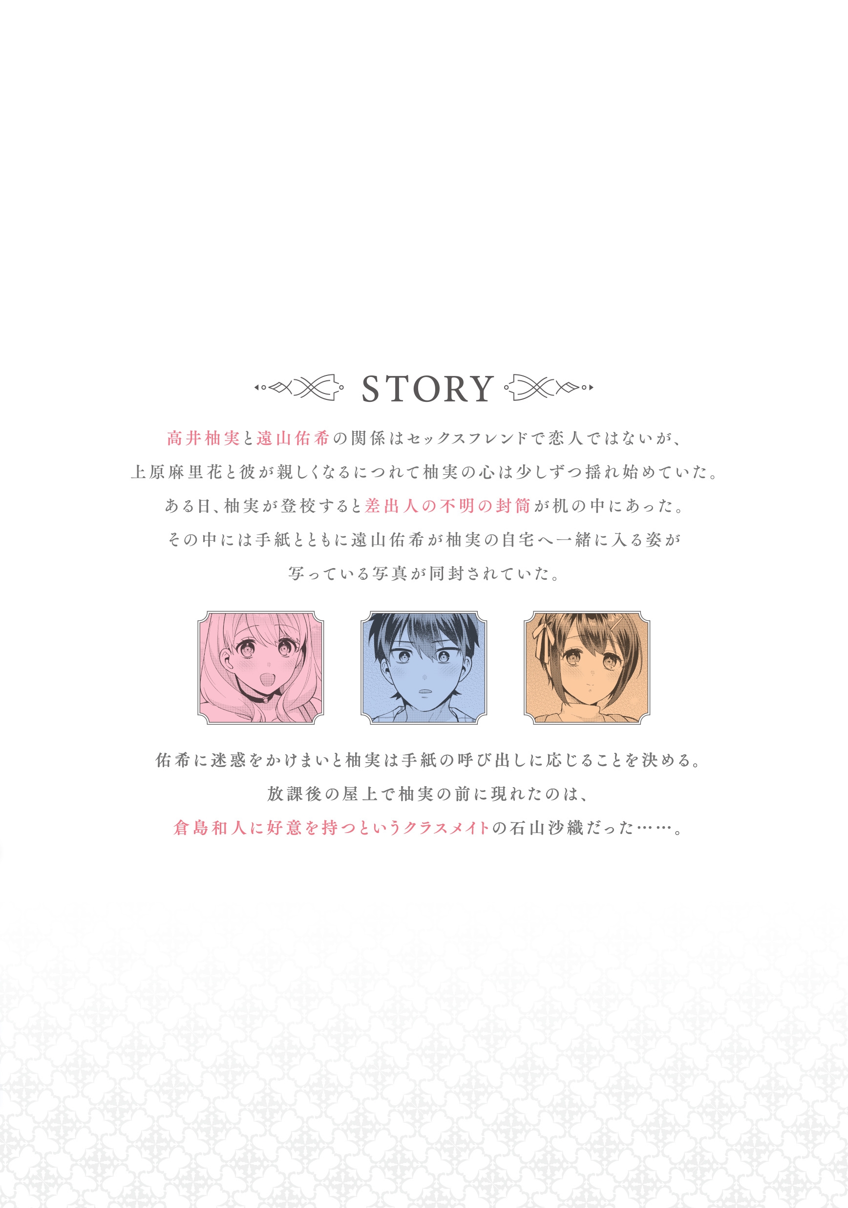 高井柚実と遠山佑希の関係はセックスフレンドで恋人ではないが、上原麻里花と彼が親しくなるにつれて柚実の心は少しずつ揺れ始めていた。ある日、柚実が登校すると差出人の不明の封筒が机の中にあった。その中には手紙とともに遠山佑希が柚実の自宅へ一緒に入る姿が写っている写真が同封されていた。佑希に迷惑をかけまいと柚実は手紙の呼び出しに応じることを決める。放課後の屋上で柚実の前に現れたのは、倉島和人に好意を持つというクラスメイトの石山沙織だった……。生々しくも甘酸っぱい青春ラブコメディ完結! 二人のヒロインとのその後を描いたちょっとエッチな描き下ろしも収録!
