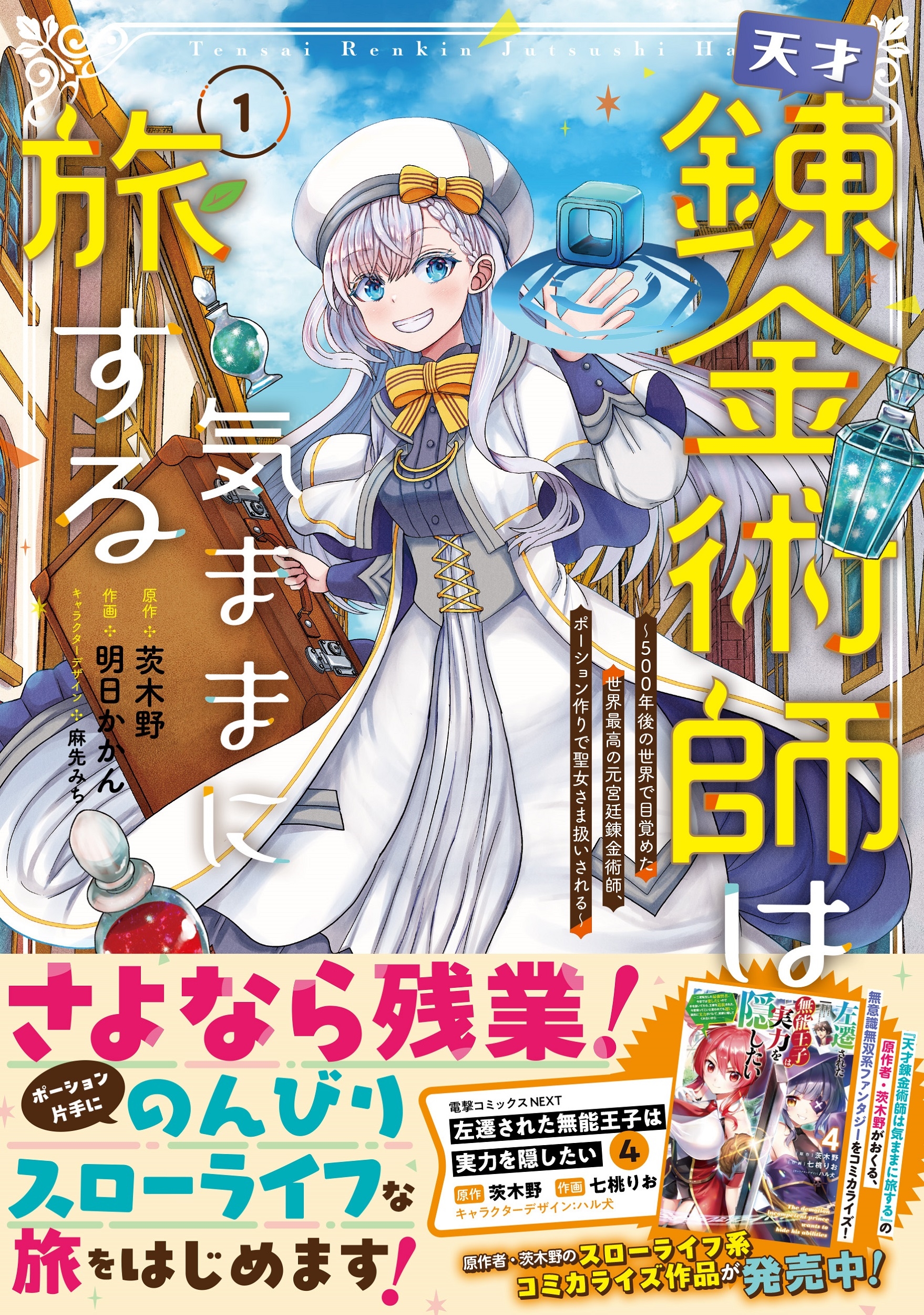史上最年少で宮廷錬金術師となった少女、セイ・ファートは毎日激務に追われていた。そんなある日、突然モンスターの大群に王都が襲撃され、難を逃れるため、「仮死ポーション」を飲んだセイが次に目覚めたのは500年後だった……!? 王都は既に滅んでおり、激務から解放されたセイは、すっかり変わってしまった世界をポーションを作りながら旅してみようと決意する。だが自由気ままに旅をするはずが、セイの天才的なポーションの技術は瞬く間にあちこちで噂になっていき……!? 天才錬金術師ののんびりスローライフな旅がはじまる!
