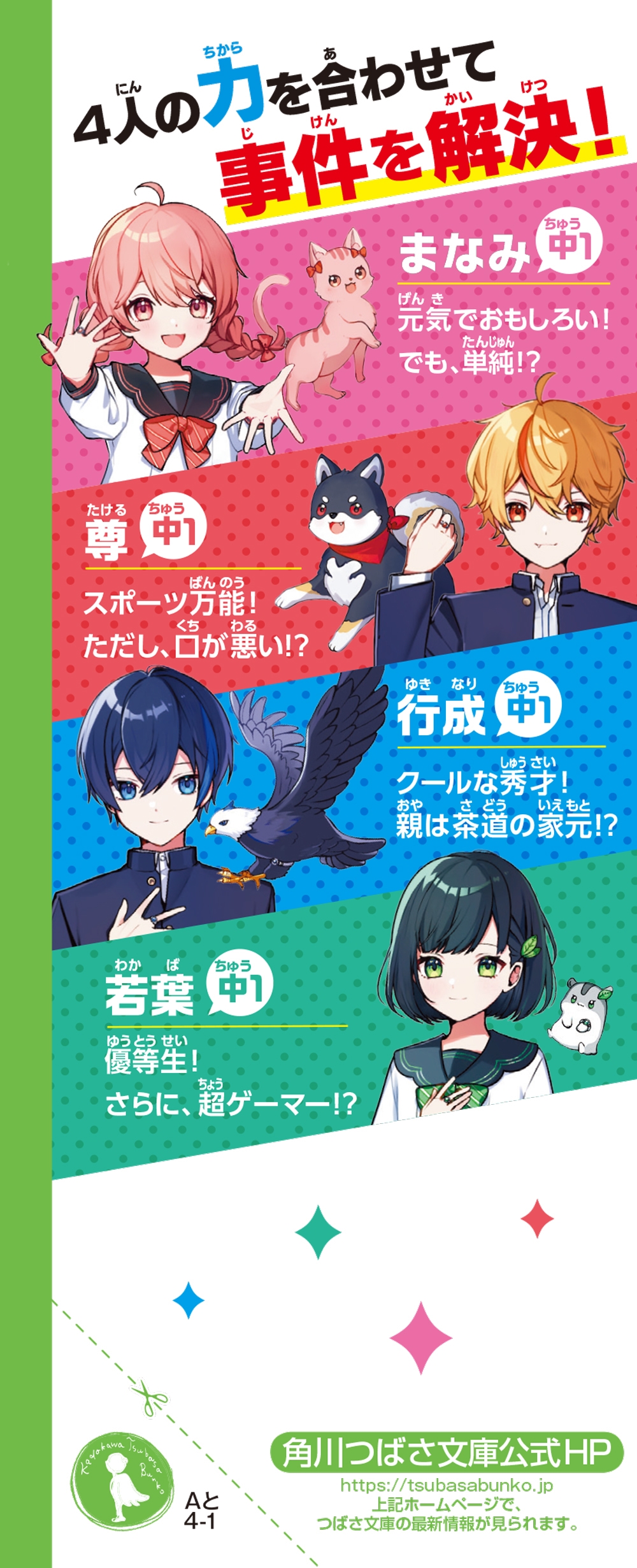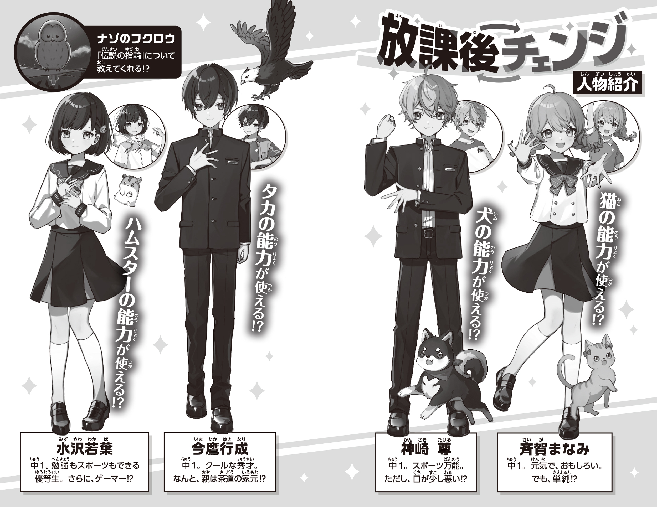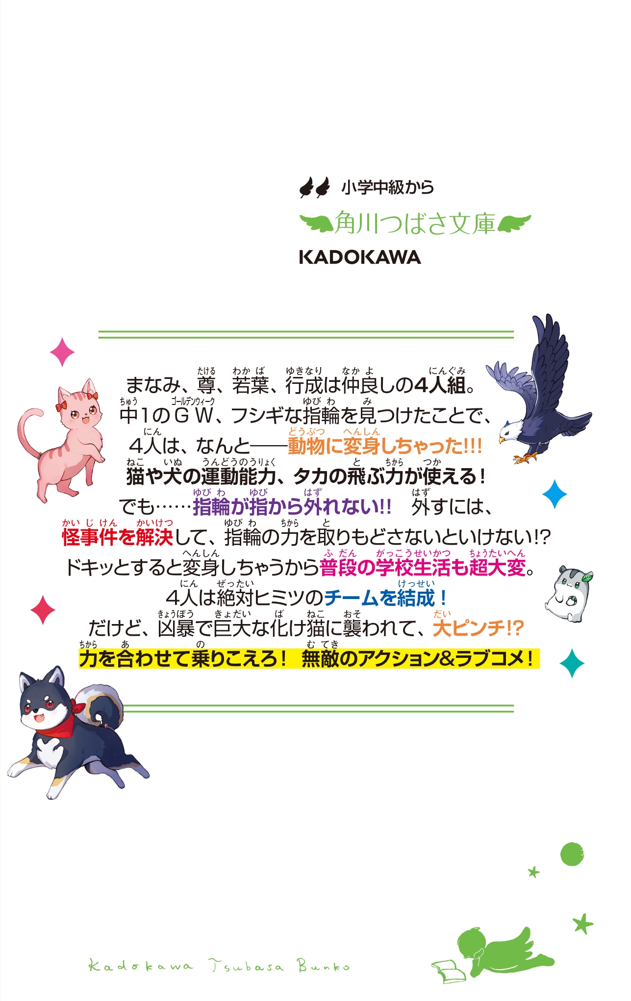 まなみ、尊、若葉、行成は仲良しの4人組。中1のGW、フシギな指輪を見つけたことで、4人は、なんと、動物に変身しちゃった!!! 猫や犬の運動能力、タカの飛ぶ力が使える! でも……指輪が指から外れない? 外すには、怪事件を解決して、指輪の力を取りもどさないといけない! ドキッとすると変身しちゃうから普段の学校生活も超大変。4人は絶対ヒミツのチームを結成! だけど、凶暴で巨大な化け猫に襲われて、大ピンチ。力を合わせて乗りこえろ! 無敵のアクション&ラブコメ!