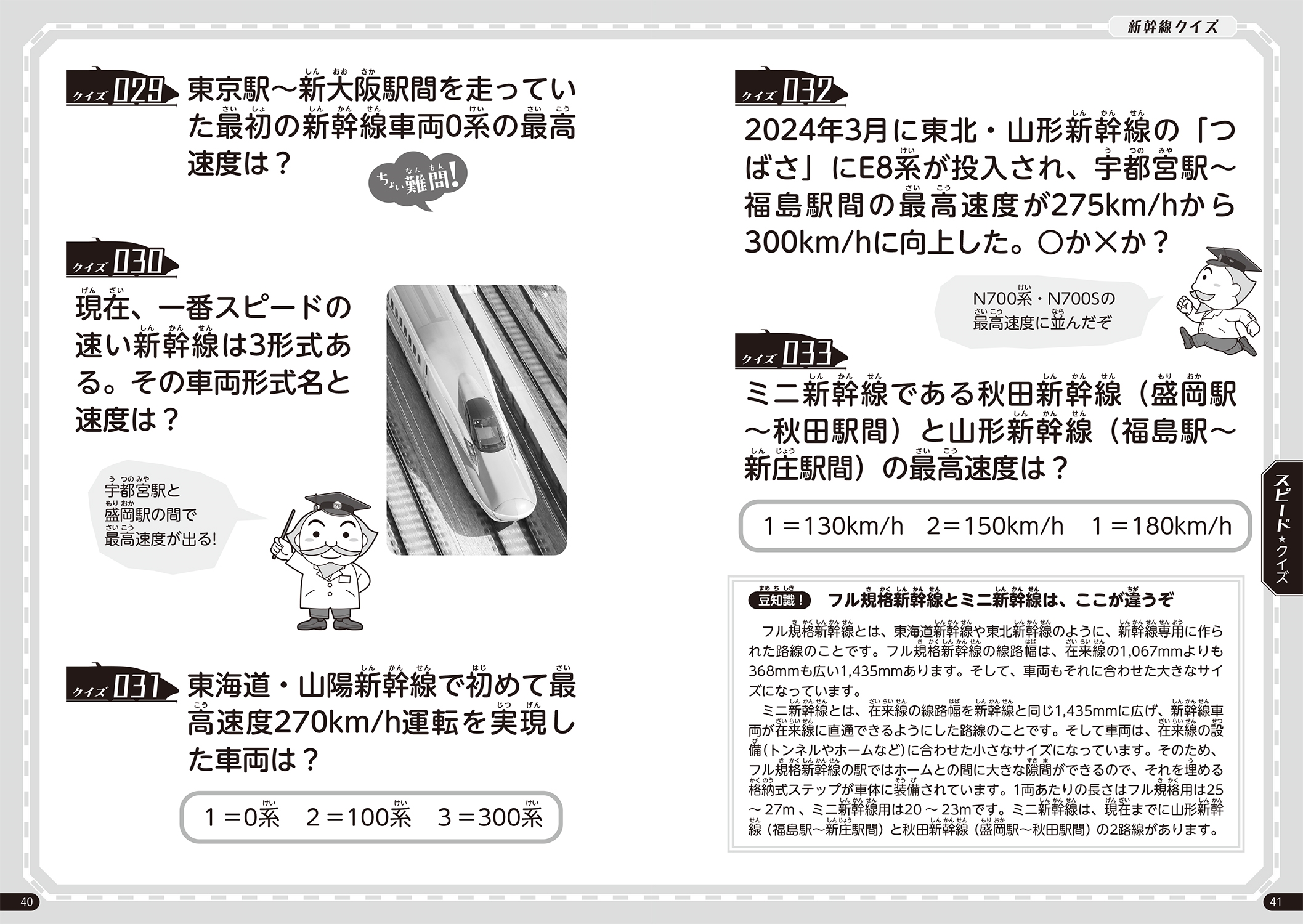 鉄道好きの子どもはたくさんいます。本書ではクイズ形式で、楽しみながら、知識のレベルを高めていけるよう工夫します。初心者向けの内容から、鉄道マニアしか知らないような上級者向けの内容まで、幅広く取り上げます。 鉄道の知識は、社会科(地理・歴史・経済)や、図画工作(技術・車体・性能)にも関連することが含まれています。また、鉄道網は46都道府県に張り巡らされていて(沖縄では、モノレールが運行)、各都道府県や、東日本と西日本などによって、歴史・技術・車体・性能・経済が異なるため、地域の特色も伝えていきます。