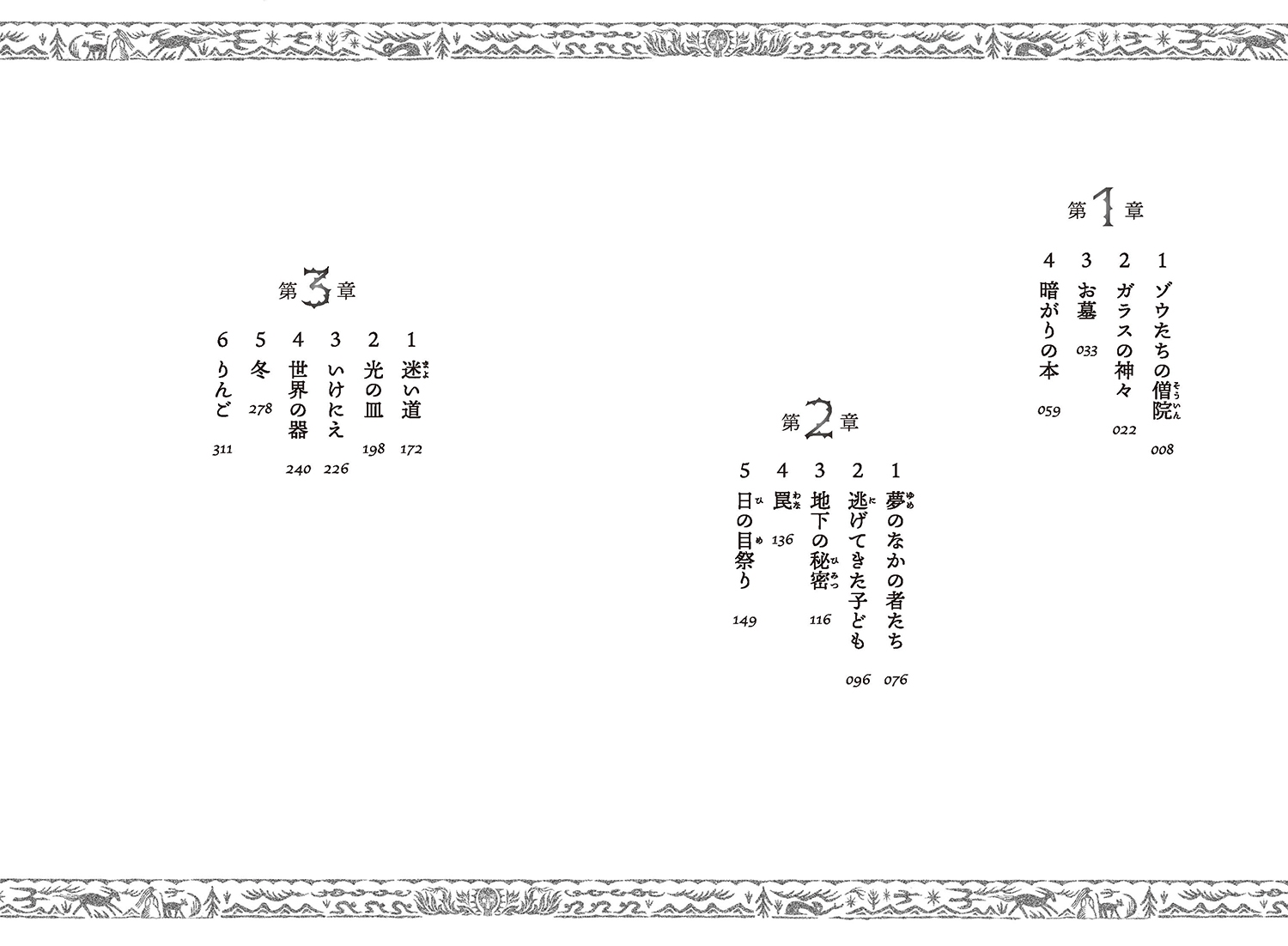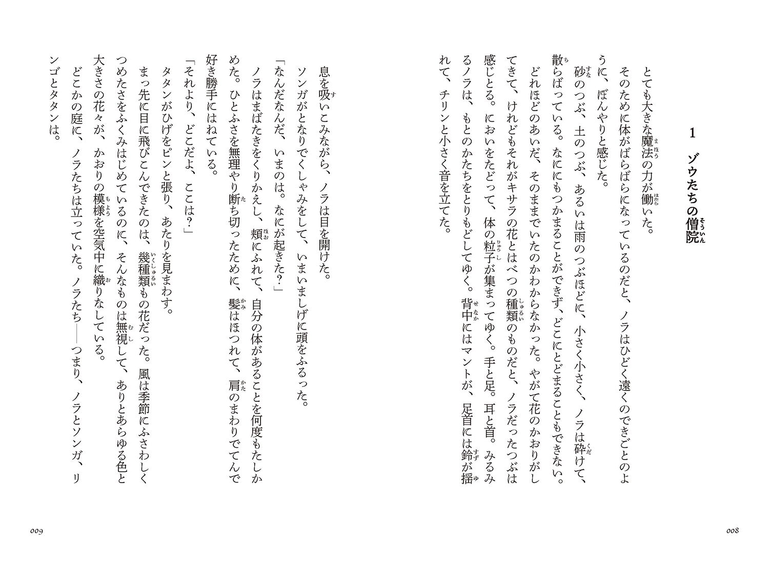……大きな魔法が働いて、ノラたちは〈あかつきの町〉の僧院にいた。言葉を話すゾウたちの僧院で、ノラは父の墓と、父が書き残した本がここにあることを知る。この町は、神炉の火をたくわえる研究をしていた人間たちの町だった。図書館で父の本を見つけるが、書かれていたことに打ちのめされるノラ。