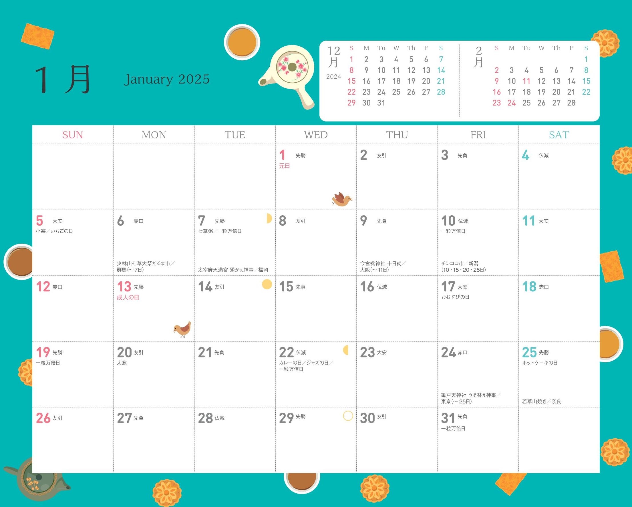 祝日はことりたちのイラストでにぎやかにお知らせ。ほかにも月の満ち欠けや⼀粒万倍日などの吉日、六曜、⼆⼗四節気、雑節もわかります。