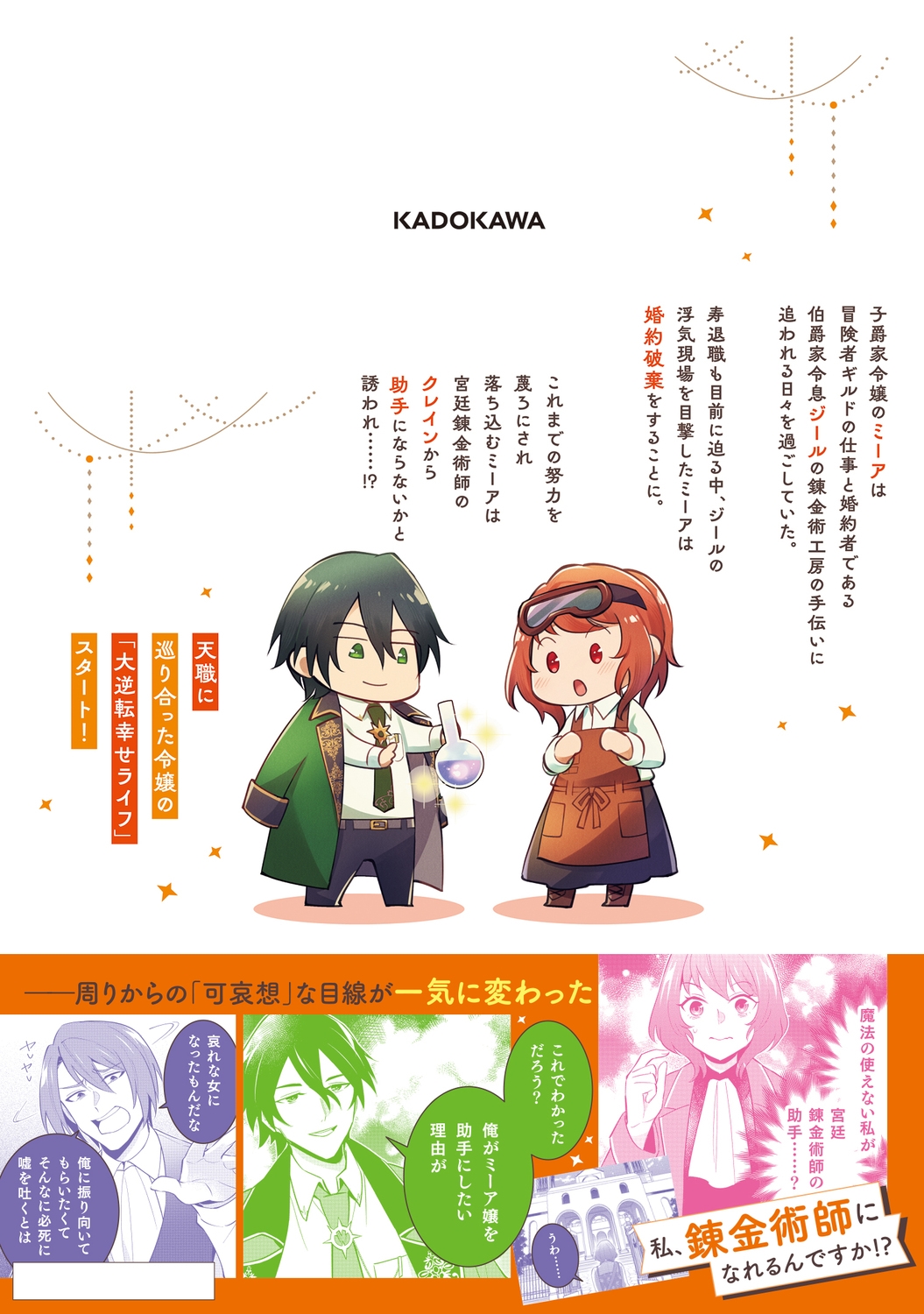 ギルドの受付で働くミーアは、寿退職目前で婚約者の浮気を目撃してしまう。婚約を破棄した彼女に舞い込んだのは、まさかの「宮廷錬金術師の助手」のオファー!? 天職に巡り合った令嬢の、お仕事ファンタジー開幕!