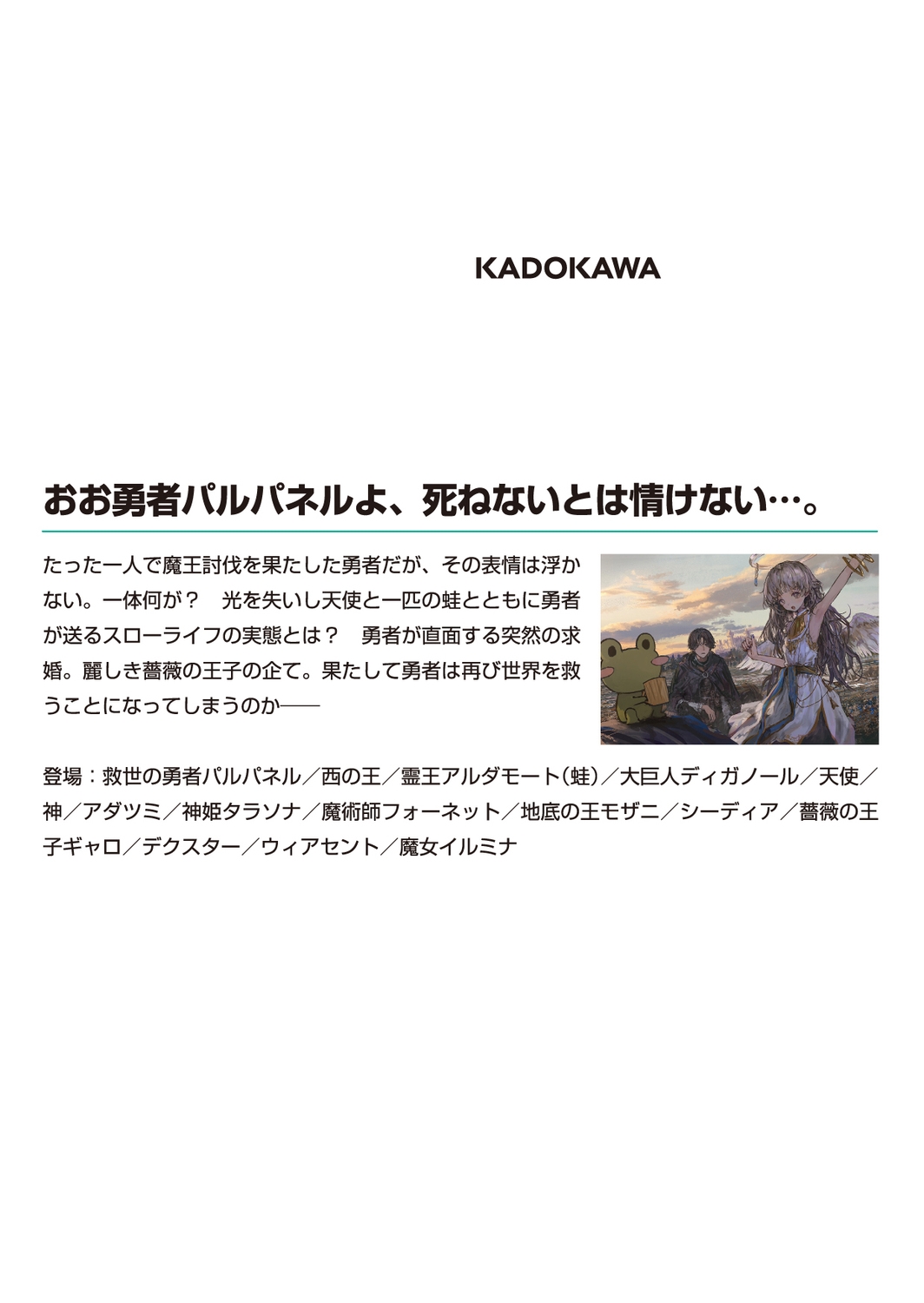 たった一人で魔王討伐を果たした勇者だが、その表情は浮かない。一体何が? 光を失いし天使と一匹の蛙とともに勇者が送るスローライフの実態とは? 果たして勇者は再び世界を救うことになってしまうのか――
