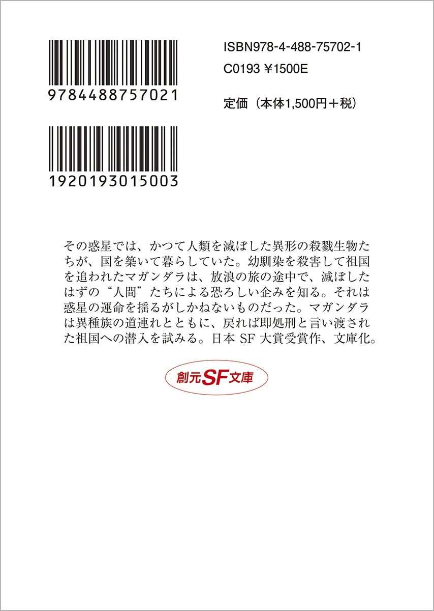 その惑星では、かつて人類を滅ぼした異形の殺戮生物たちが、国を築いて暮らしていた。幼馴染を殺害して祖国を追われたマガンダラは、放浪の旅の途中で、滅ぼしたはずの"人間"たちによる恐ろしい企みを知る。それは惑星の運命を揺るがしかねないものだった。マガンダラは異種族の道連れとともに、戻れば即処刑と言い渡された祖国への潜入を試みる。日本SF大賞受賞作、文庫化。解説=円城塔