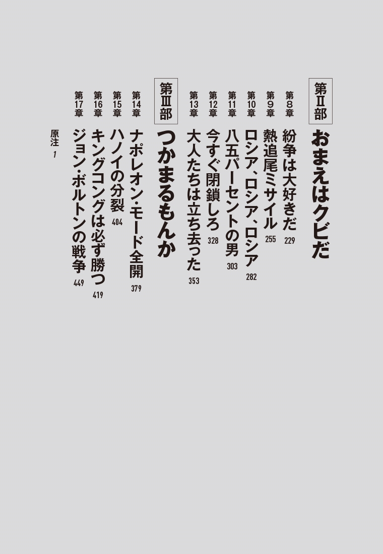 噓、忖度、虚勢、欺瞞、脅迫、裏切り……ホワイトハウスの裏側からの独占的なスクープや、これまで伝えられてこなかった数々のエピソードを通して、緊張感に満ちながら、時にどこか滑稽な大統領執務室のシーンに読者を引き込んでゆく。
