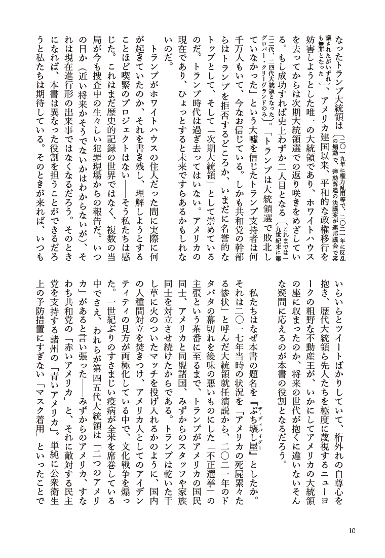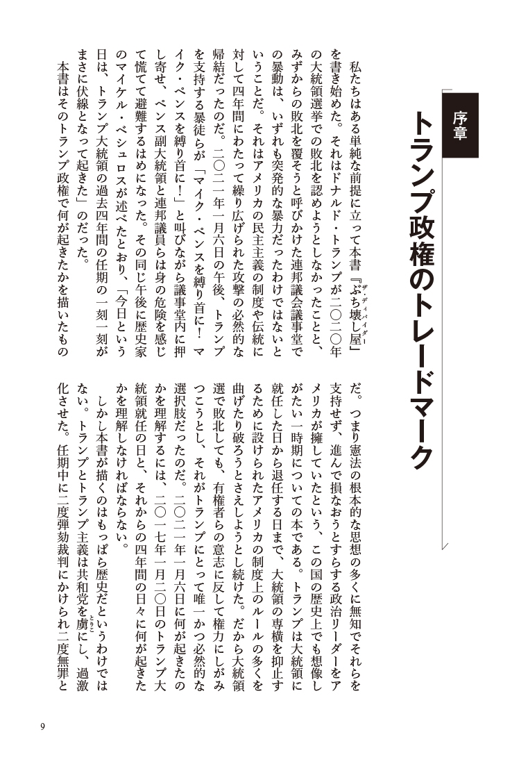 2021年1月6日の連邦議会議事堂襲撃事件は、単なる異常な出来事ではなく、ドナルド・トランプが4年間にわたって繰り広げた、ワシントンに対するルールなき戦いの必然的なクライマックスだった──。本書は、歴代大統領を取材し続けてきたホワイトハウス主任記者が、300に及ぶ独占インタビューのほかプライベートな日記やメモ、メールなどの一次資料に基づいて、混乱に満ちた始まりから暴力的な結末に至るまでのトランプ政権のすべてを網羅し、その内情を詳細に描き出した決定版である。