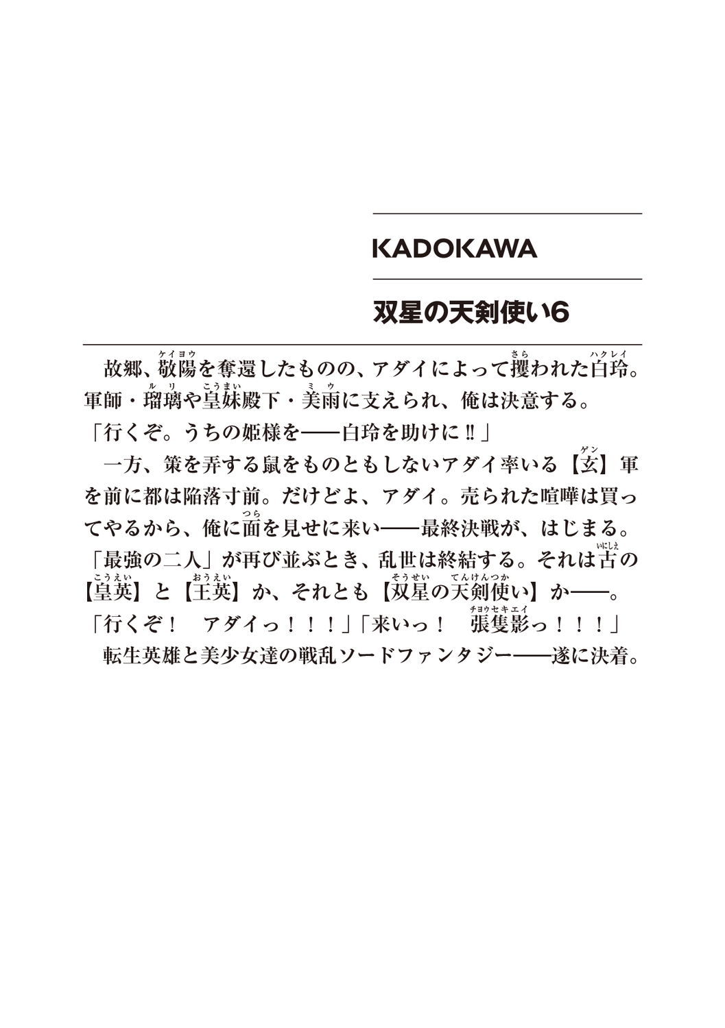攫われた白玲、それは【玄】皇帝アダイによる最終決戦への誘いだった。「最強の二人」が再び並ぶとき、乱世は終結する。皇英と王英、双星の天剣――時を超えた全ての宿命が、辿り着く先は。英雄譚、決着の第六幕。