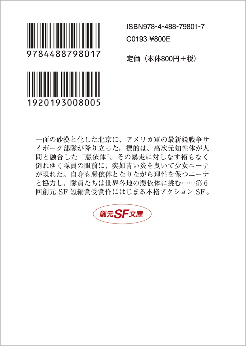 一面の砂漠と化した北京に、アメリカ軍の最新鋭戦争サイボーグ部隊が降り立った。標的は、高次元知性体が人間と融合した"憑依体"。その暴走に対しなす術もなく倒れゆく隊員の眼前に、突如青い炎を曳いて少女ニーナが現れた。自身も憑依体となりながら理性を保つニーナと協力し、隊員たちは世界各地の憑依体に挑む……第6回創元SF短編賞受賞作にはじまる本格アクションSF。解説=堺 三保