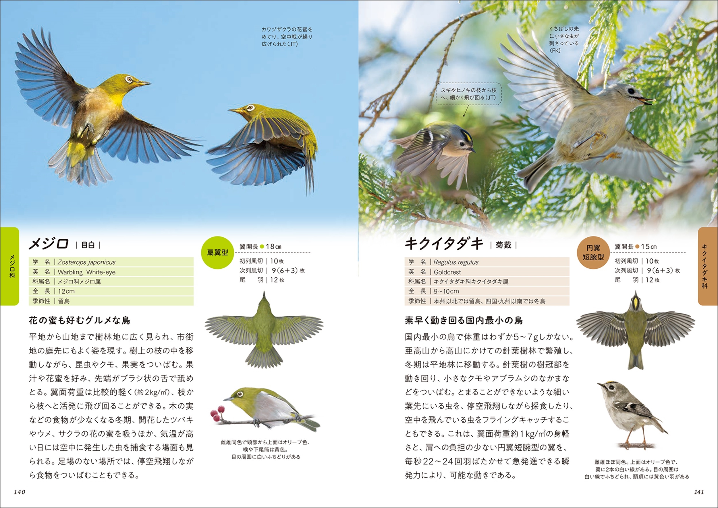 翼を広げた状態と止まりのイラスト、翼開長や羽の枚数など、飛翔に関わるデータも全種収録しています。