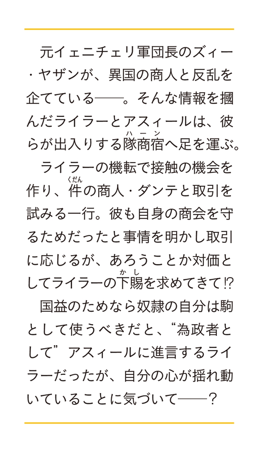 ライラ―の活躍で地位を追われた元イェニチェリ軍団長のズィー・ヤザンが、今度は異国の商人と反乱を企てている――。