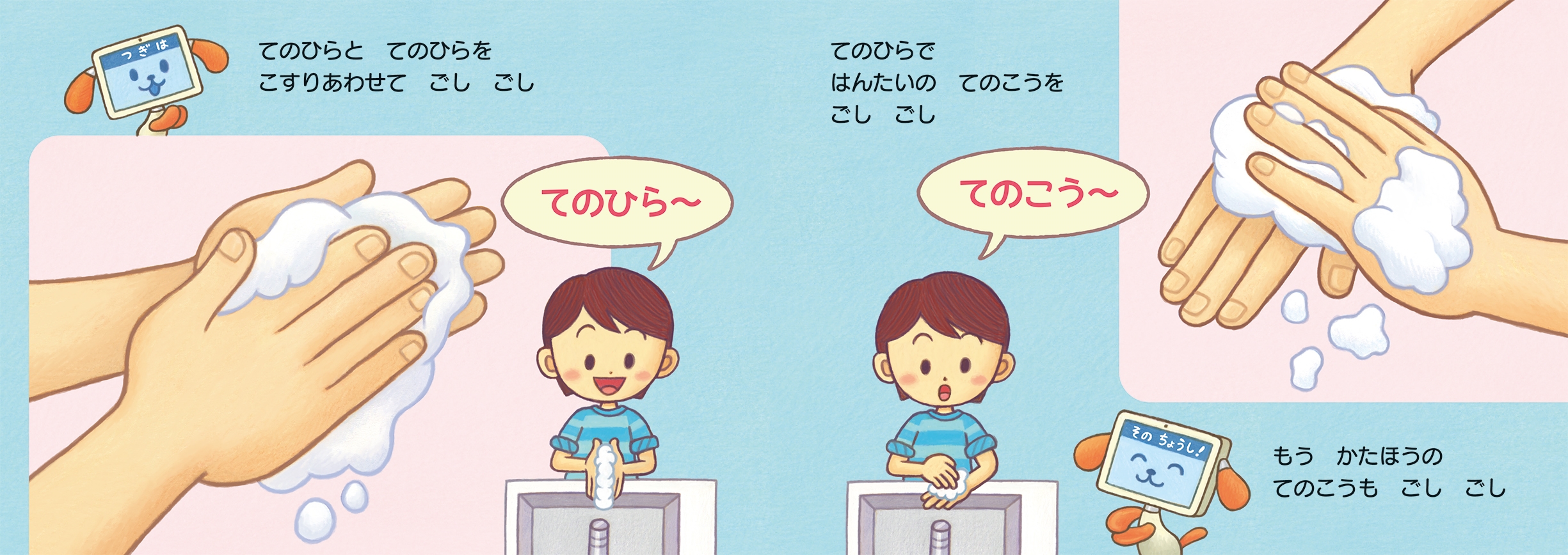 あらちゃんが学校で教えてもらった手洗いアプリ。さっそくロボットの犬のメカわんにダウンロードして、あらちゃんの手をカメラで映してみると、「さいきんや ウイルス」がたくさん! 絵本を読みながら手を洗い、きれいな手で「いただきます!」をしましょう。