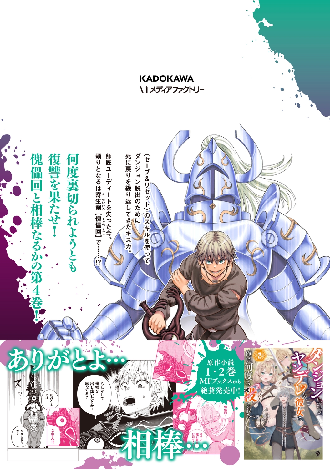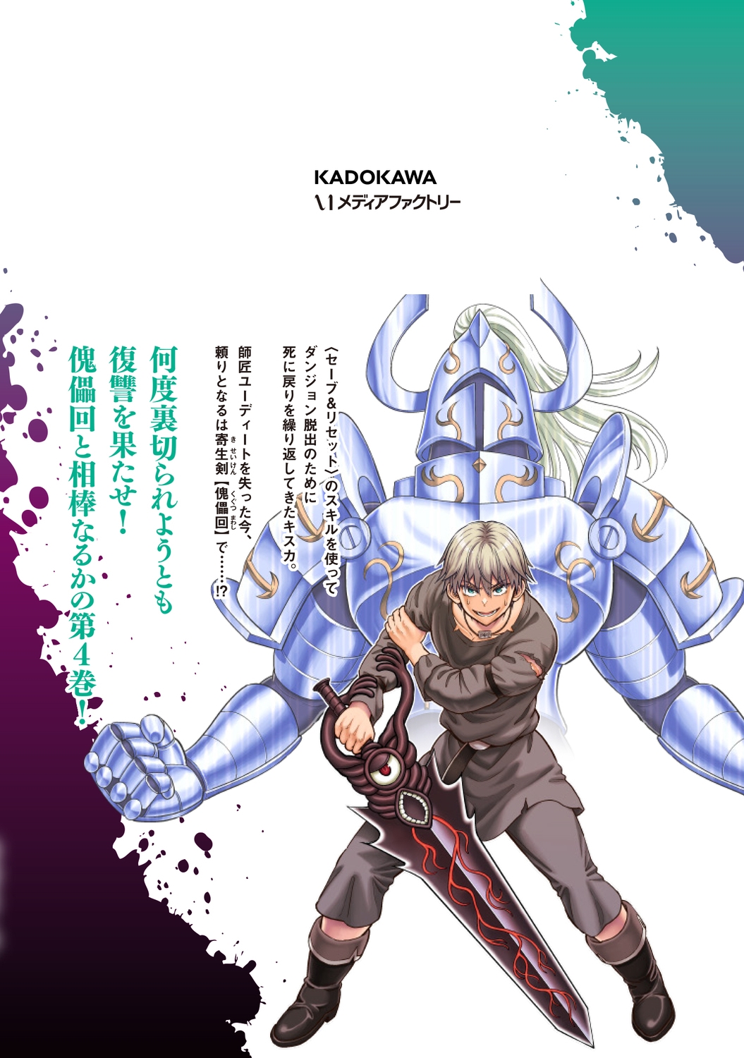 <セーブ&リセット>スキルを用いて、ダンジョン脱出のために死に戻りを繰り返してきたキスカ。師匠ユーディートを失った今、頼りとなるは寄生剣・傀儡回で……!? 何度裏切られても復讐を果たせ! 傀儡回と相棒なるかの第4巻!