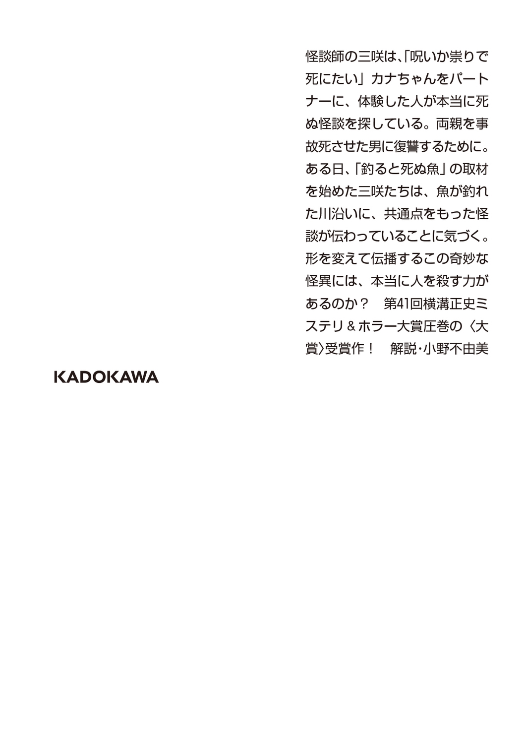 怪談師を生業としている三咲は、体験した人が本当に死ぬ怪談を探している。相棒は「呪いか祟りで死にたい」というカナちゃんだ。新たな怪談が見つかると、死ねるかどうか確かめてくれる。そうして"本物"を見つけたら、あの男に復讐ができる。