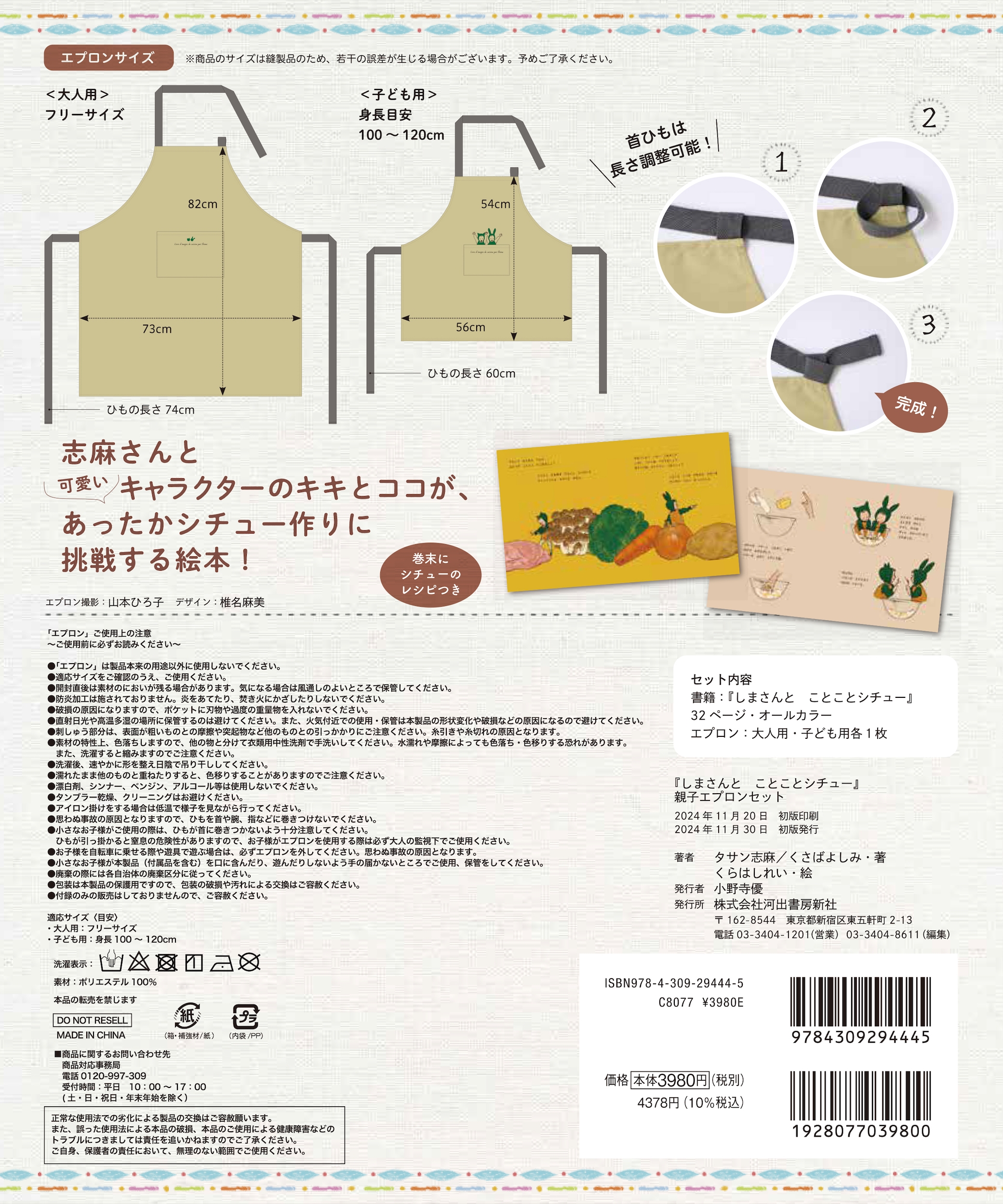 そんな志麻さんの思いから生まれた絵本と、人気イラストレーターのくらはしれいさんによる可愛いキャラクターイラストがワンポイント刺繍された、完全オリジナルの親子エプロン2枚がついたBOXセット。しっかりした生地で、プレゼントにも最適な1冊です!