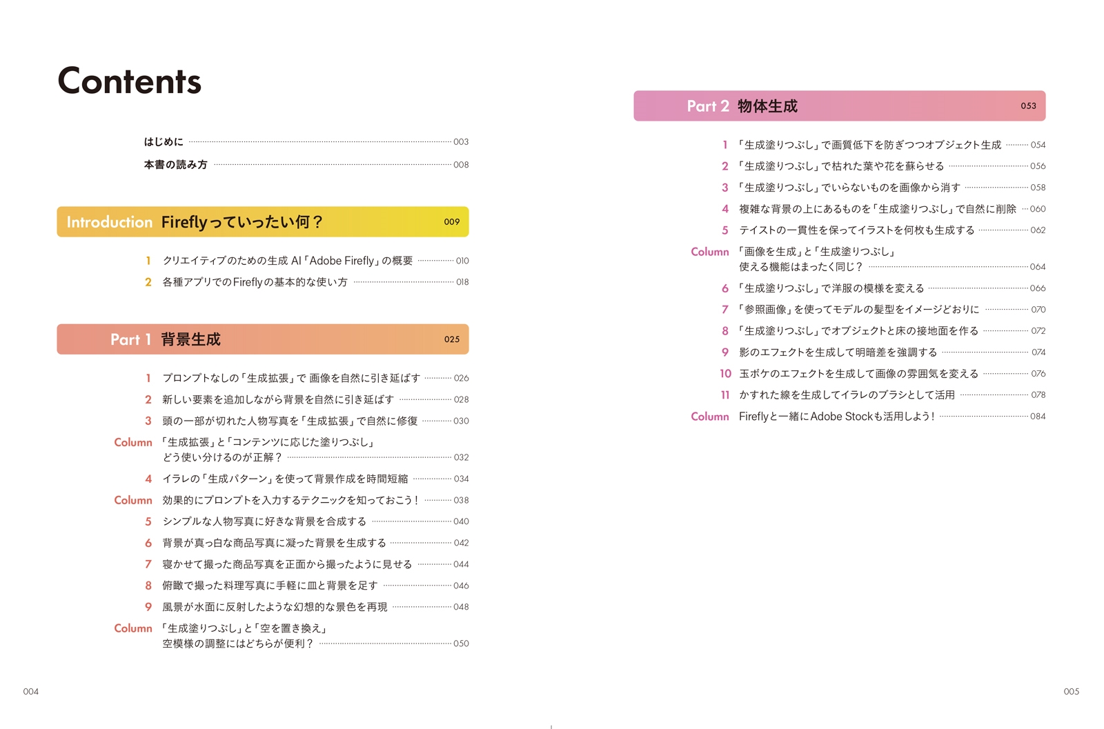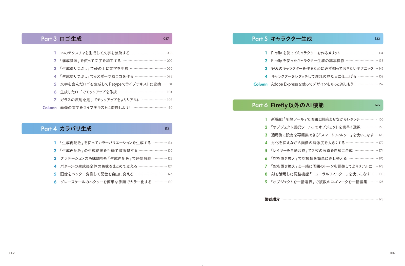 本書では、Photoshop、Illustrator、Firefly Webアプリ、Adobe ExpressでFireflyを扱うための基本的な手順をはじめ、新しいデザインのたたき台を作る際に使いたいテクニック、プロのクリエイターの時短・効率化に役立つテクニックなどを全7章に分けて掲載しています。