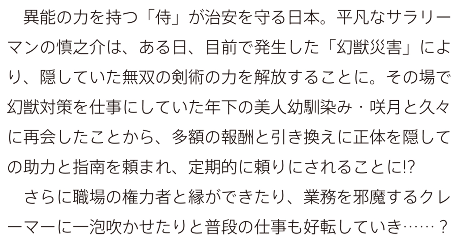 異能の力を持つ「侍」が治安を守る日本。平凡なサラリーマンの慎之介は、ある日、目前で発生した「幻獣災害」により、隠していた無双の剣術の力を解放することに。