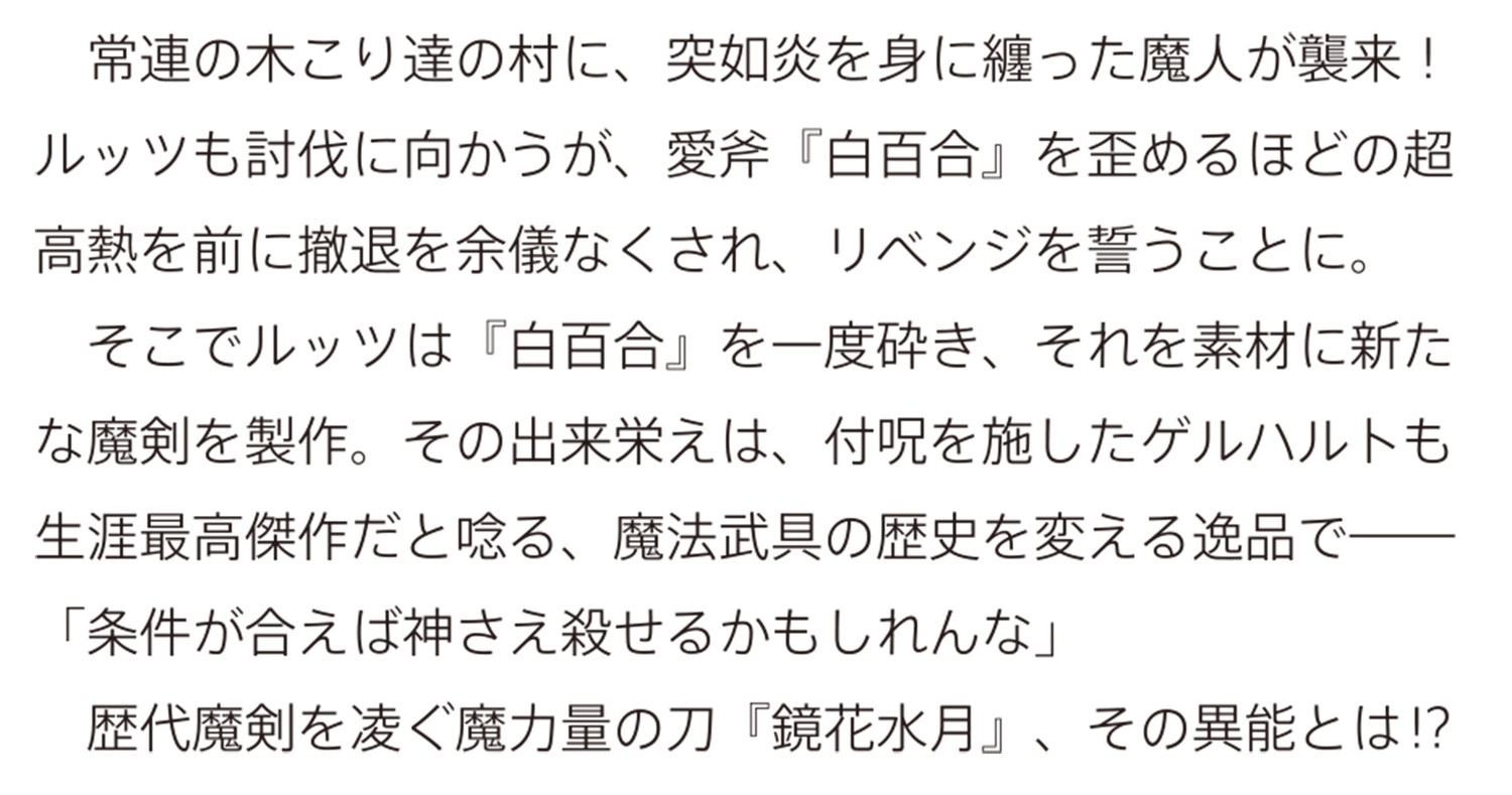 常連の木こり達の村に、突如炎を身に纏った魔人が襲来!ルッツも討伐に向かうが、愛斧『白百合』を歪めるほどの超高熱を前に撤退を余儀なくされ、リベンジを誓うことに。